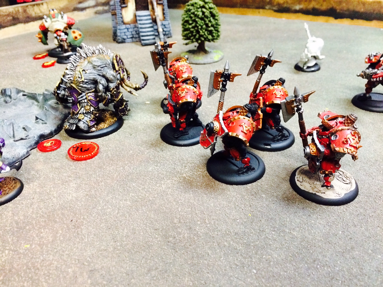 The first two turns were maneuvering, with some ineffectual shooting exchanged by both sides thanks to the inaccuracy of the Aradus Sentinel but also its Carapace that protected it from return fire. The Kodiak rushed forward to engage the Sentinel, landing some damage and throwing it. Then the Bronzeback returned the favor–sending it crashing through the Widowmaker Marksman. Normally the Bronzeback is the model that hits like a truck, but it found itself on the receiving end of the on-rushing bus that was the Man-o-Wars. On the feat turn from the Butcher. With Weaponmaster. And the charge. The Bronzeback went from perfectly healthy to crippled in an instant, and with my Beast Handlers committed to making other parts of my force continue fighting the Bronzeback was easily finished on the remaining turn–albeit taking a few of the Man-o-Wars with him.