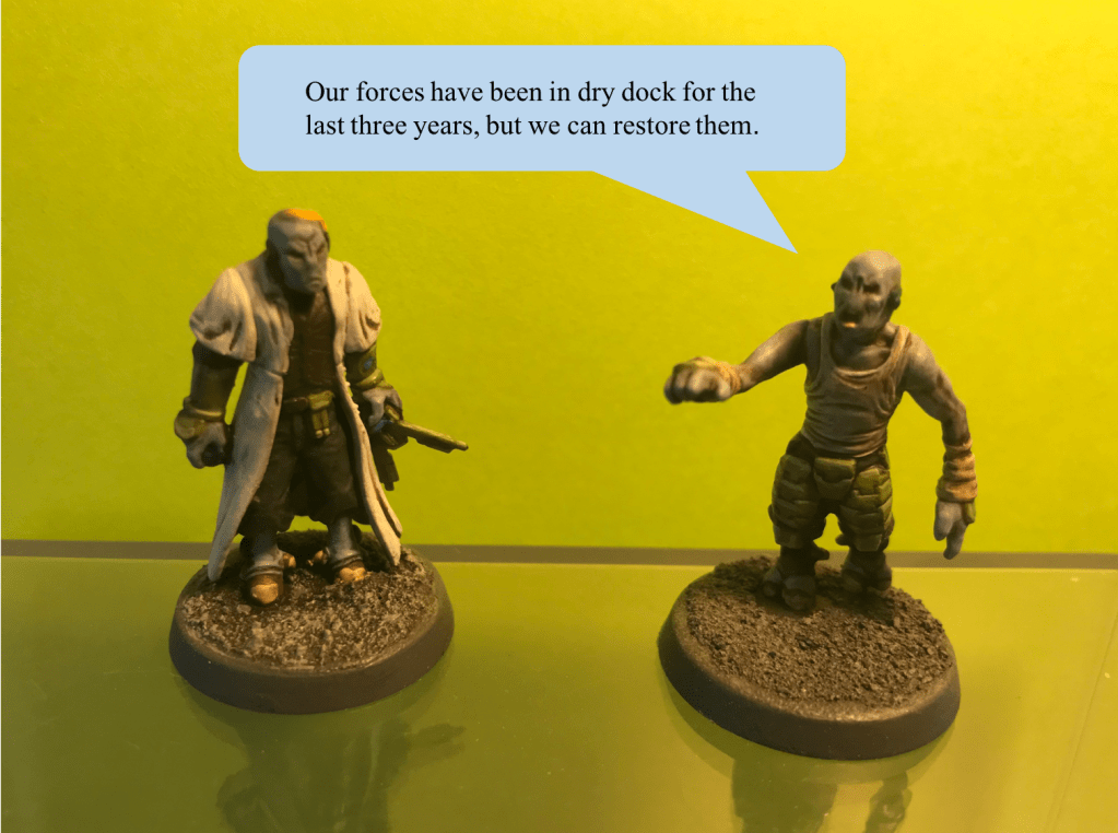 I at least have some painted models to show off at the start for once–such as these two civilians (a doctor and a dock worker) that I painted up for story mission involvement. There was the real chance I’d lose the army amid the turbulence of the three years (they even were up for consignment at my local gaming store for a while), but like the patient hunting tactic of kauyon, the Tau have been waiting for their return even when away.