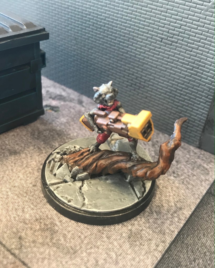 Painted up Rocket Raccoon. I’m pretty pleased with his suit (did the Avengers Endgame white panels with red) and his gun, maybe less so his fur. But glad he’s done, and got in two games with him on the table–where he certainly did work.