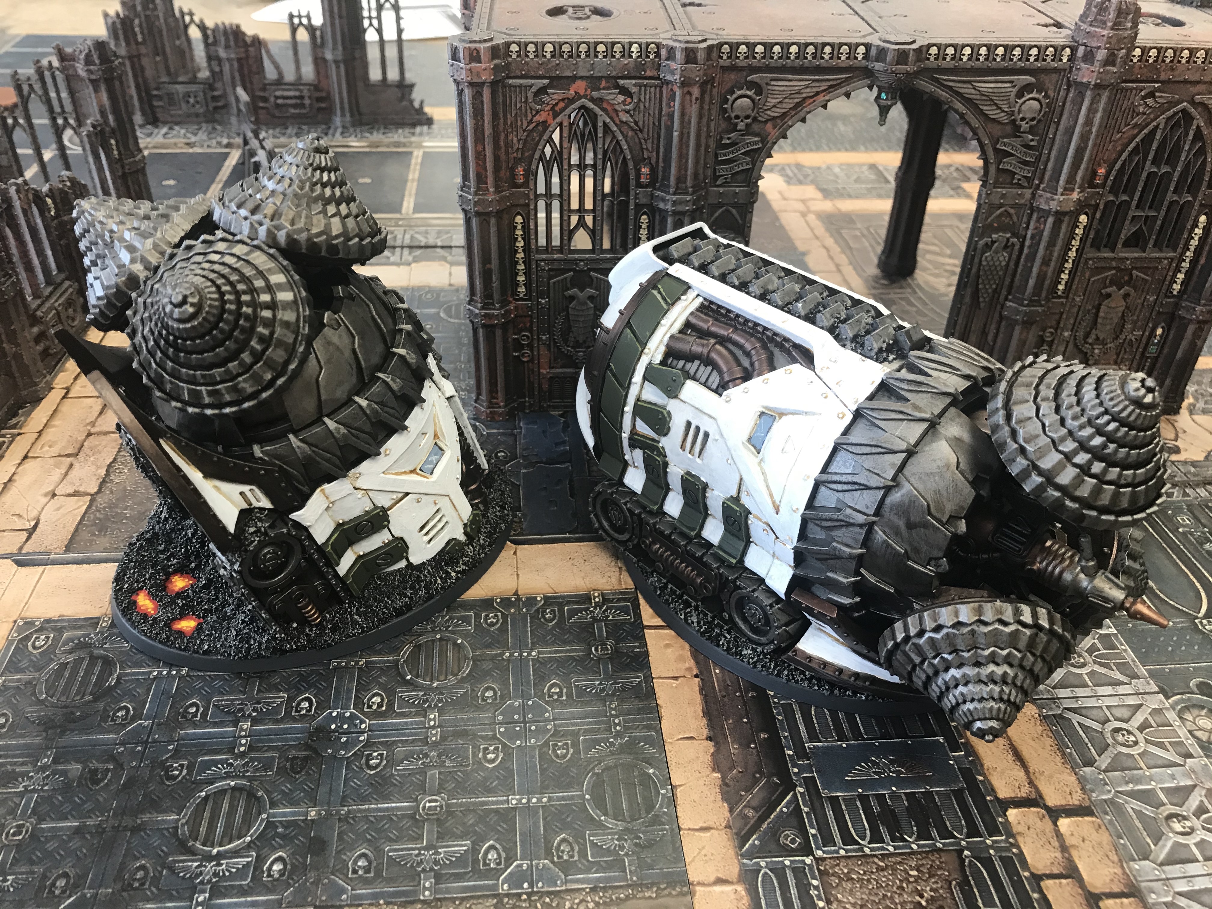 Two Termite Drills. These are from a Mantic kit, which is pretty good look and similar to the Forge World versions, at a far more manageable price (and easier-to-work-with materials). Cutting the one in half for the TMNT-like “Shredder’s Arrival” pose was a bit of challenge, but it turned out really well I felt.