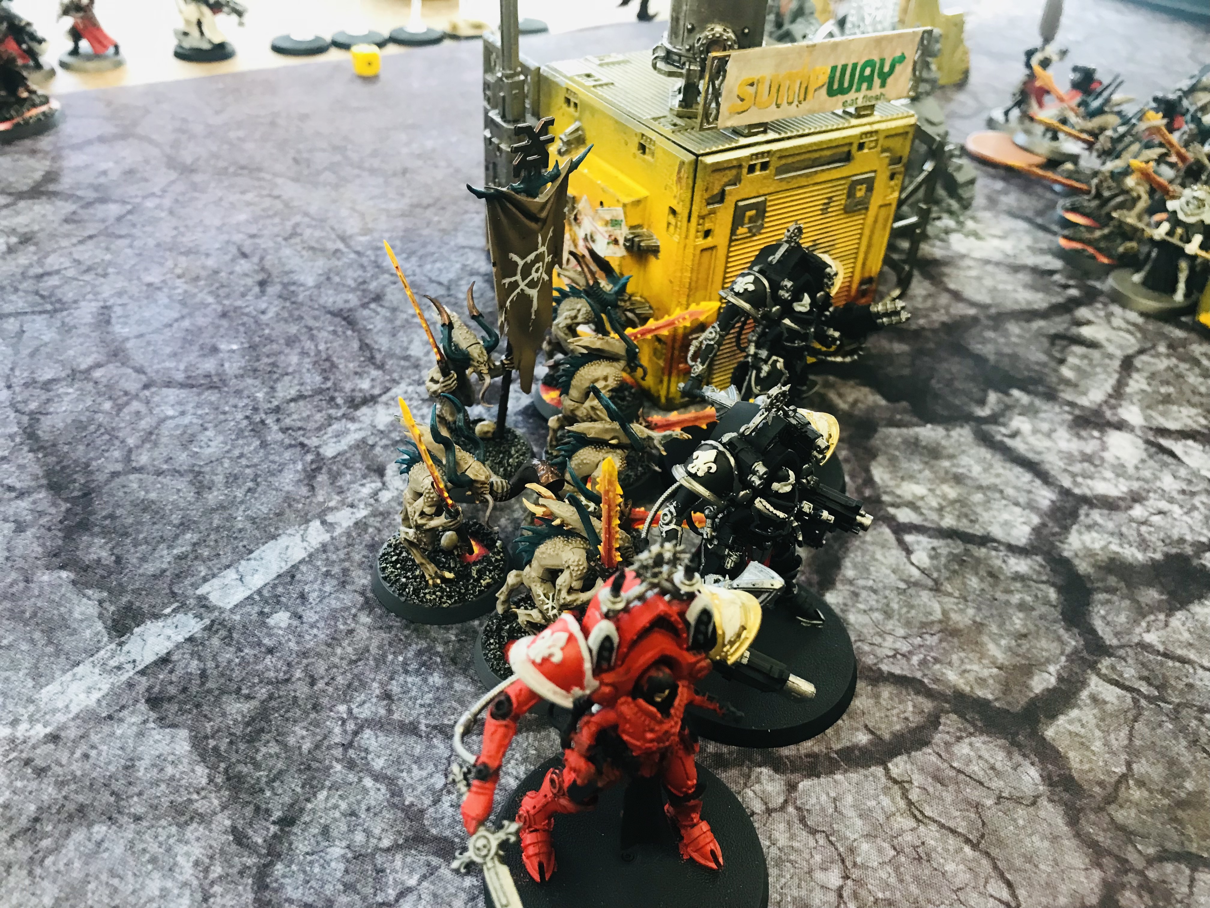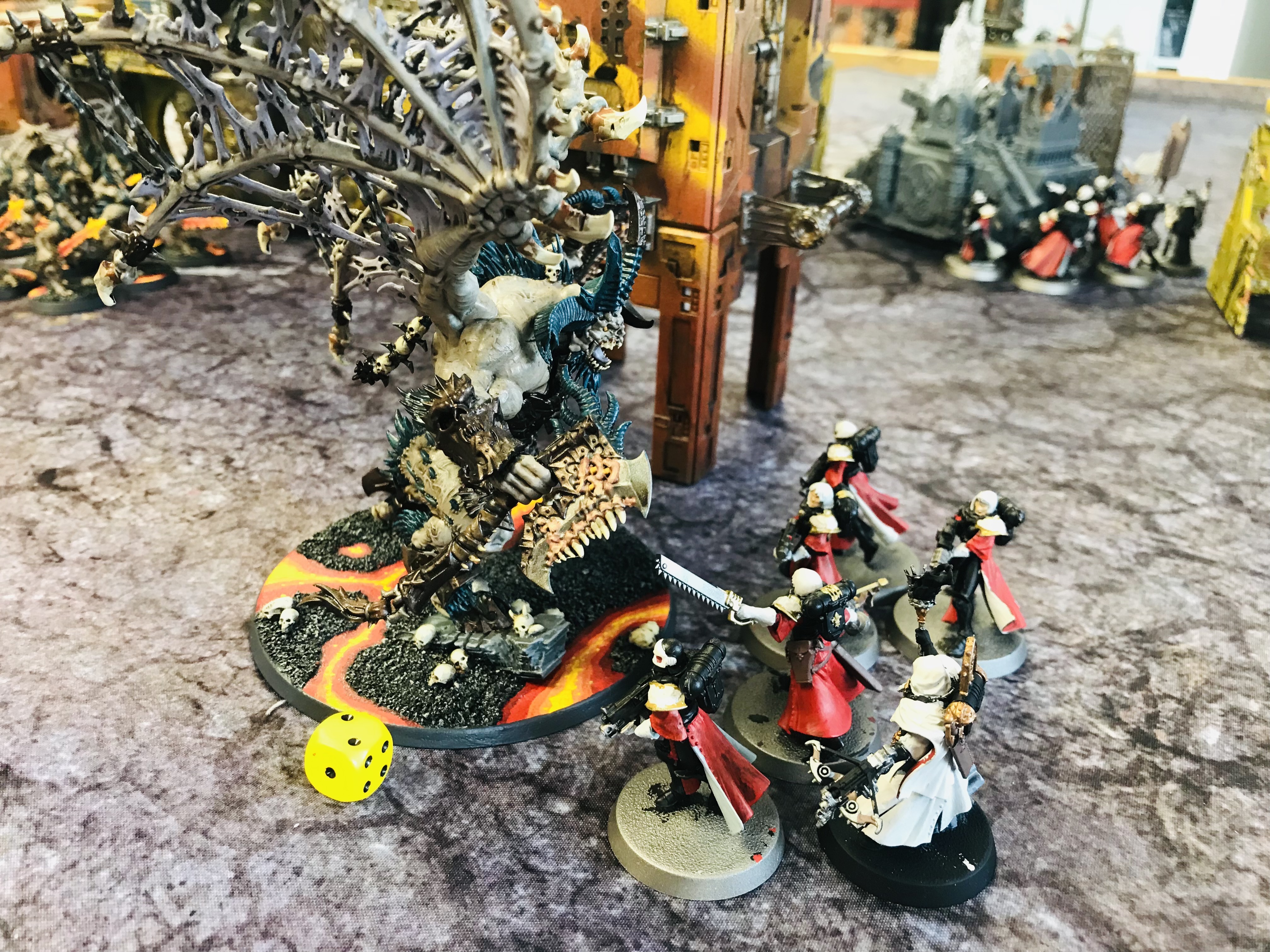 Our local game store, Drawbridge Games, is running a Crusade campaign, leveraging the Charadon: Book of Rust rules. I managed to get my first game in against Matt’s Adeptus Sororitas Sisters of Battle force. It was a good game, and I managed to keep it close until the last of my units were wiped out by his firepower. Those battlesuit sisters pack a punch. A couple of shots from the game are below.
