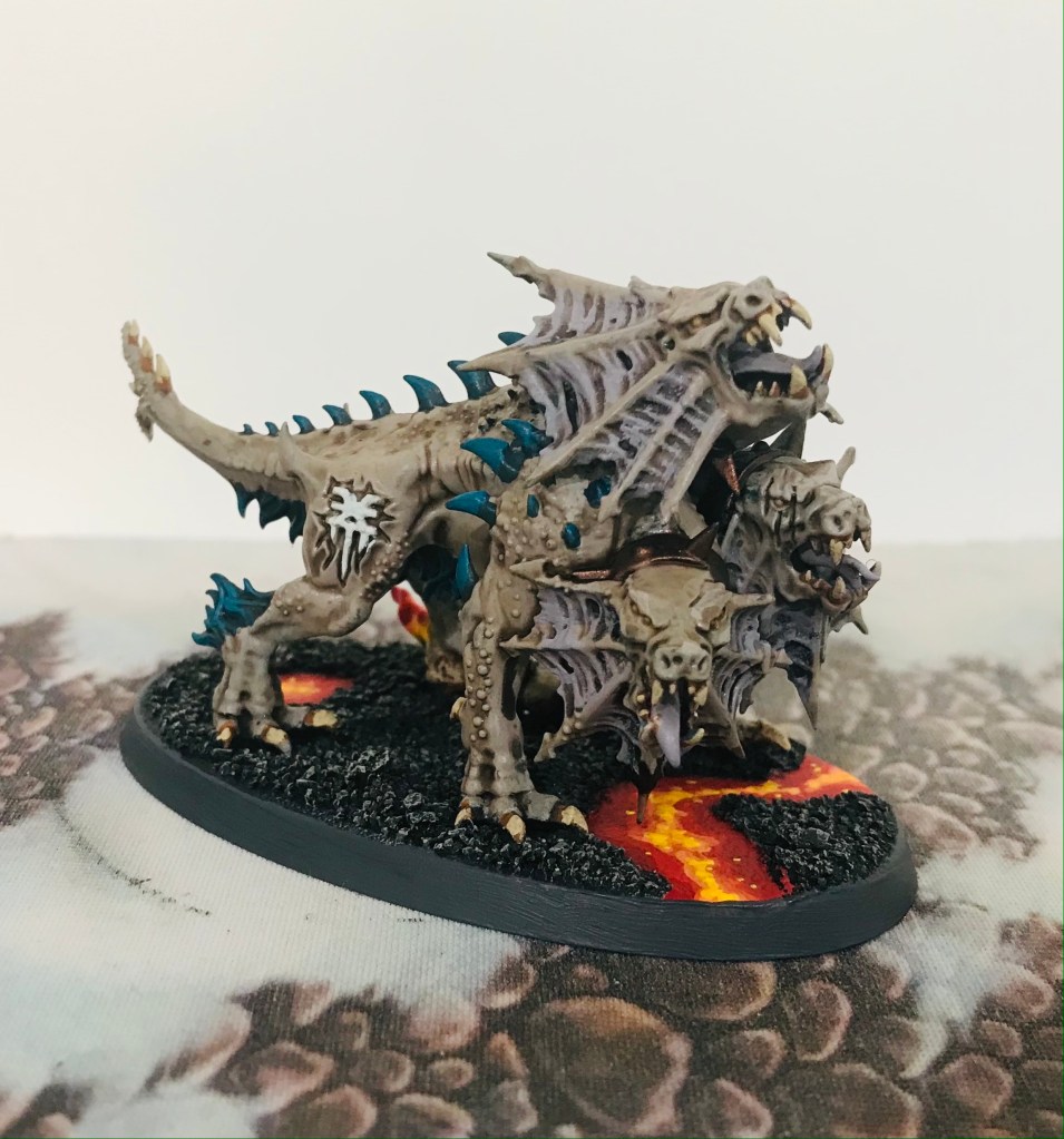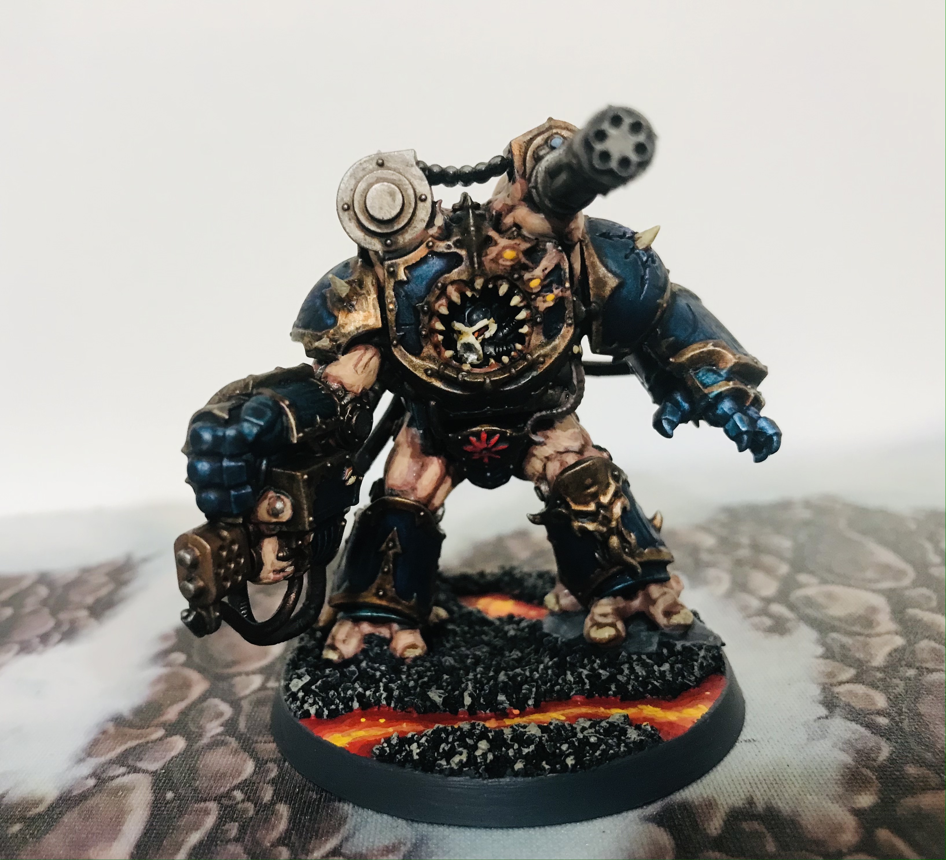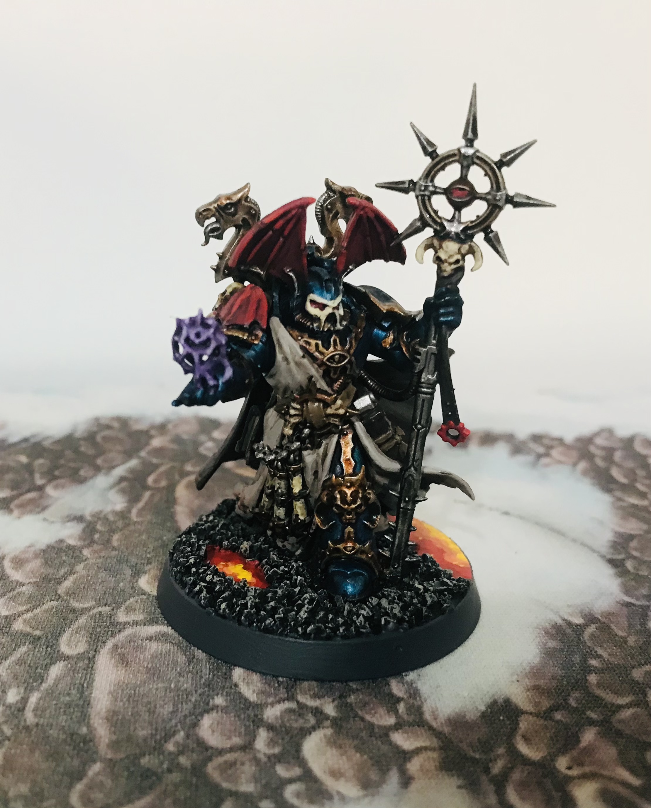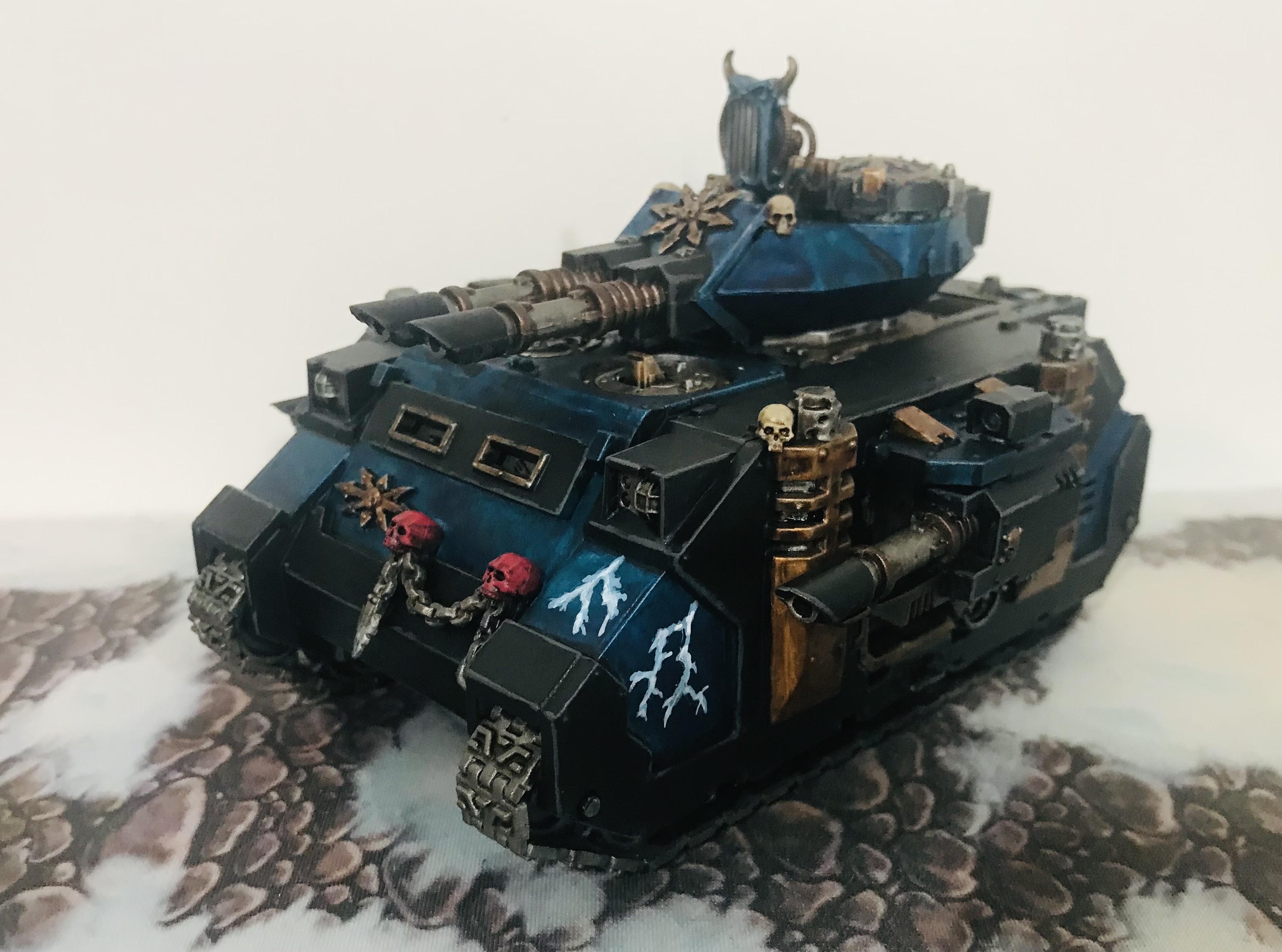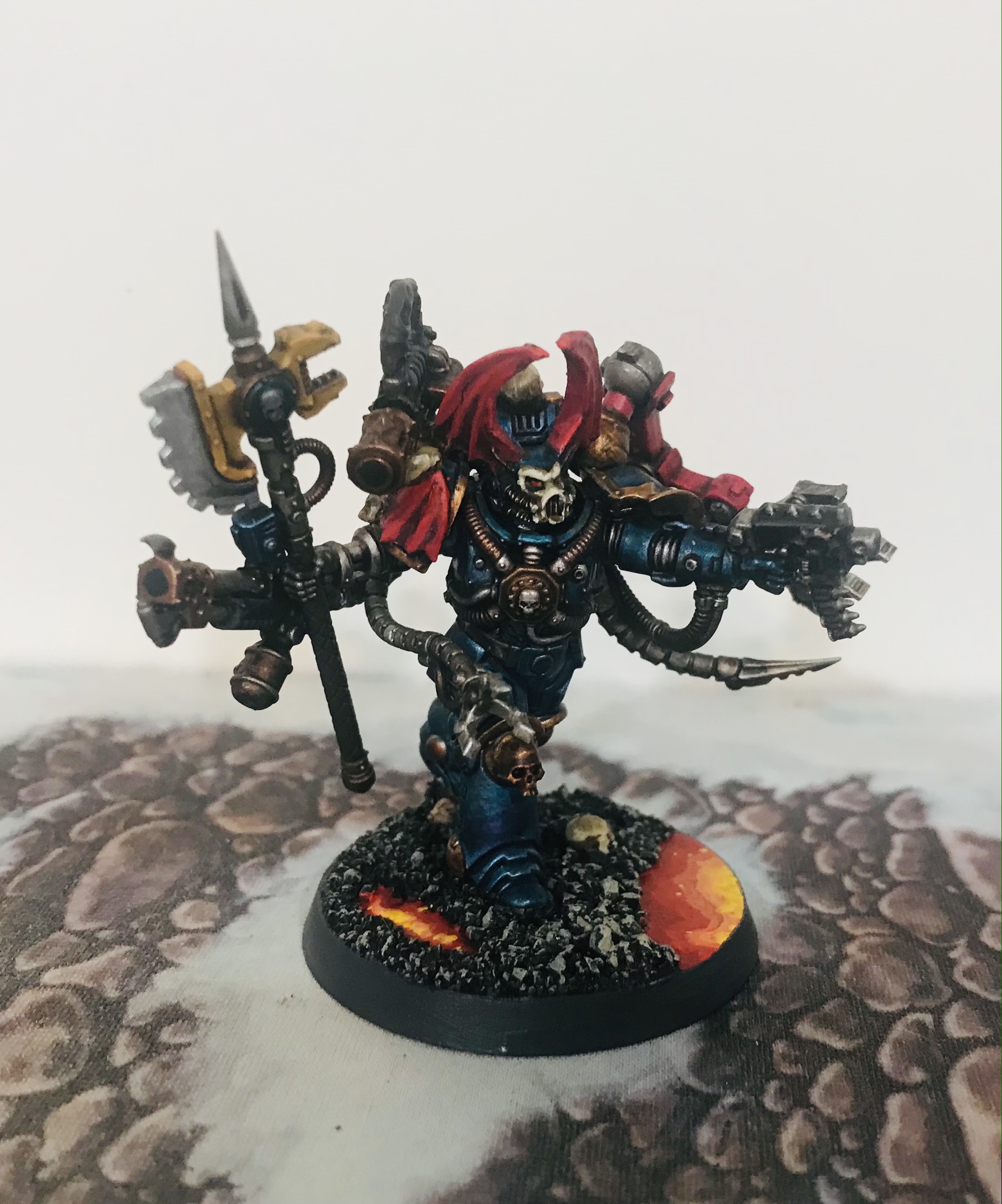 A big part of me getting excited about the Night Lords (over Word Bearers, which I also painted some test models for, and would have fit my Daemon army well), was that I found a paint scheme that I really liked. I tried a first Night Lord with a flat color paint scheme, and while it was okay, I didn’t love it. Then I found a great metallic blue tutorial for Night Lords from Kabin Miniatures (check it out here: https://youtu.be/nFJJTCEMyQY ). I gave it a try, with some of my own color tricks for the reds and leathers, and really loved how it came together. Particularly with my lava base scheme. So with some hunting around the fluff, The Night Lords 8th Legion–The Circle of Inclemency–has begun. I’ve painted more Night Lords points this month than anything else combined all year (and honestly all pandemic). Which shows me something.