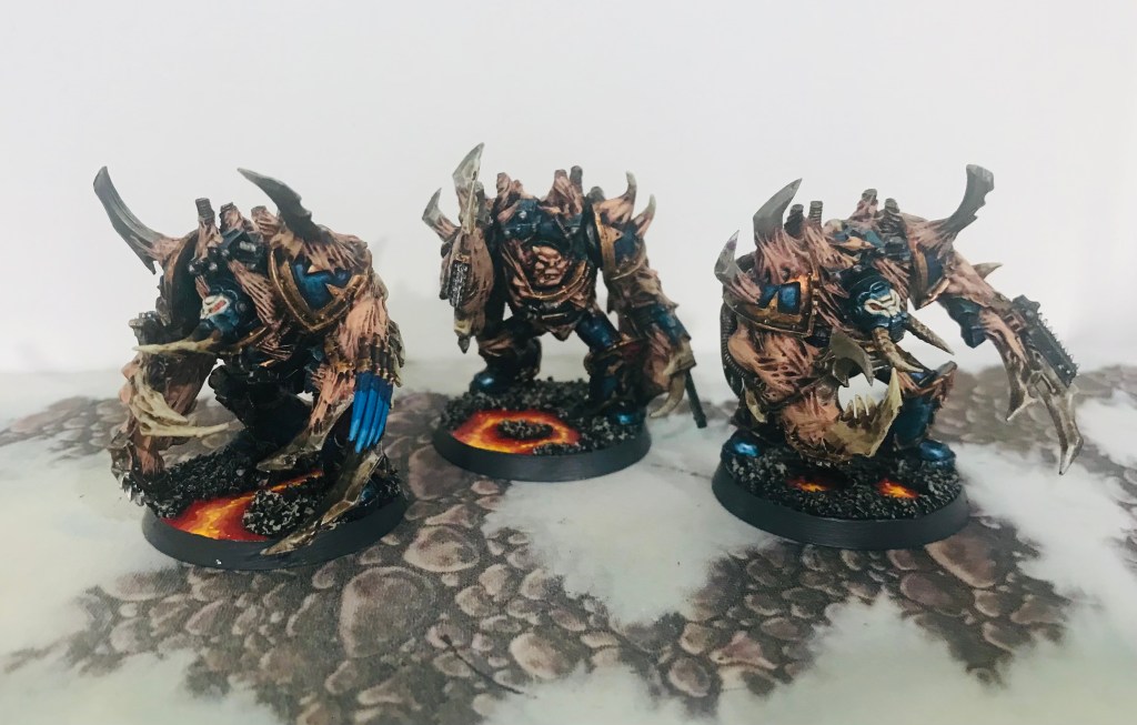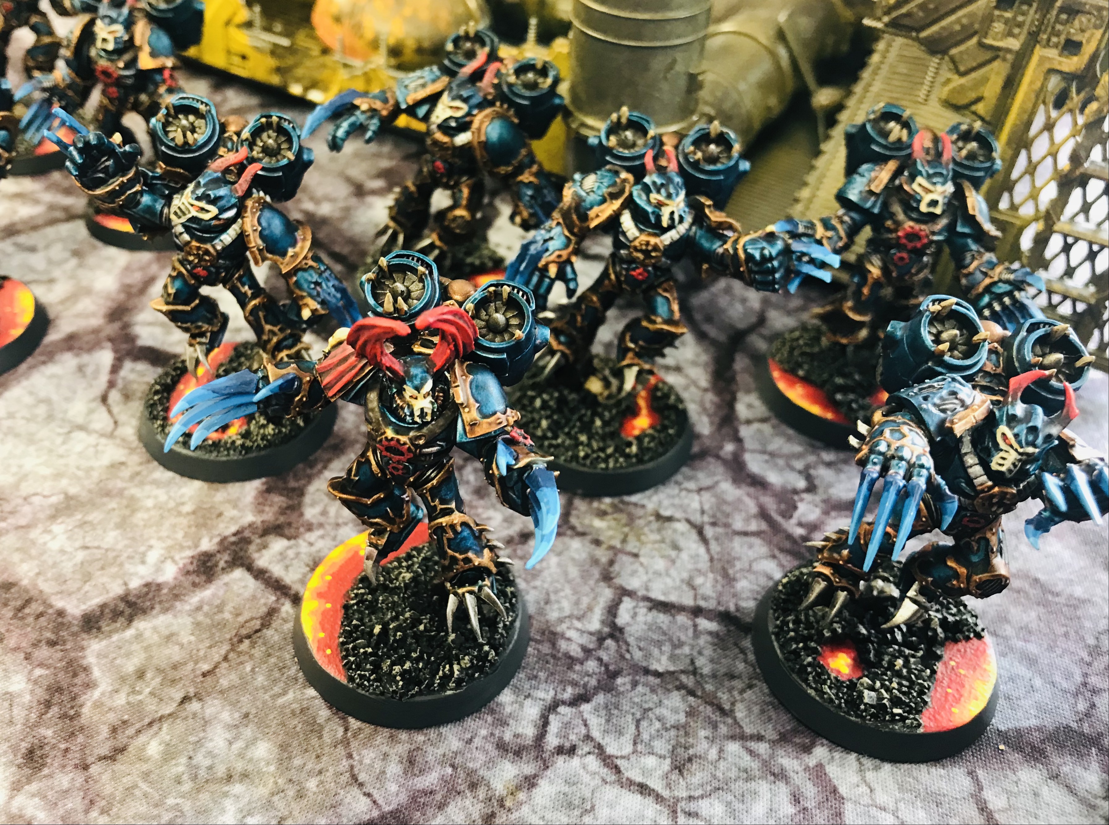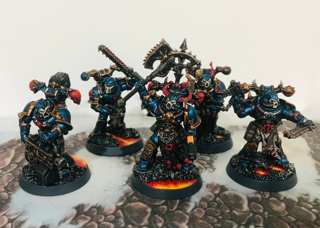 When I decided on the Night Lords (8th Legion) 8th Company, I chose it mostly as I have a growing Chaos Daemons of Khorne force, so the number 8 resonated hah. Then I found the single official fluff entry about the Night Lords 8th Legion, which had a single entry in a Forge World Book (about a Dreadnaught that fought at the Drop Site Massacre). The main thing that it said was that the 8th Company called itself “The Circle of Inclemency”. Which given my interest in Justice (professionally) made me really intrigued. The idea of an organization of joint leadership, charged with the perverse sense of harsh justice that the Night Lords as a Legion were founded on, really appealed. I envisioned their leadership to be an 8-member council (Leadership councils in other Night Lords fluff are called Kryoptera). And I envisioned that in the warp lingered a Khornate touchstone for each of the eight members of the 8th Company’s Kryoptera as well–a council of 8 Greater Daemon Bloodthirsters that drew power from the actions of the Company’s warfare. So I envisioned the following: