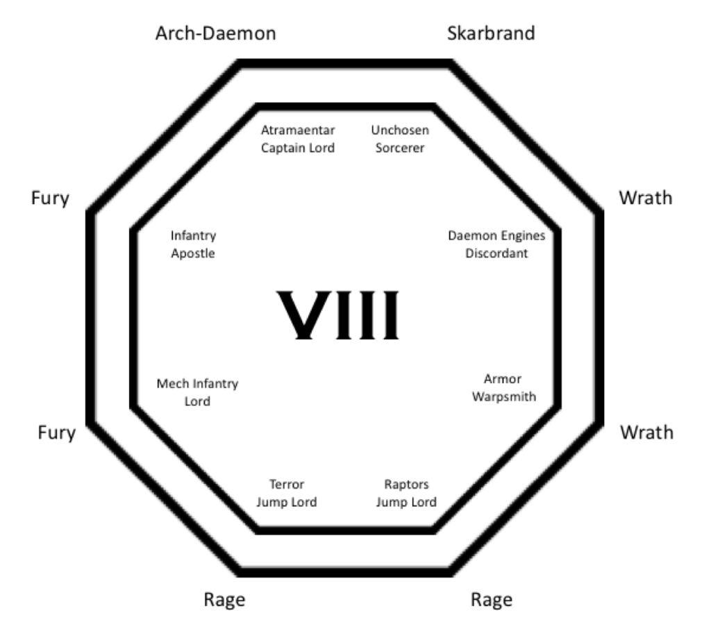 That shows the type of Bloodthirster, the sort of units that each member of the council looks after, and who those members might even be. I really like this as a way to organize my thinking about the force! The one up top is the stylized Nostroman script rune version too.