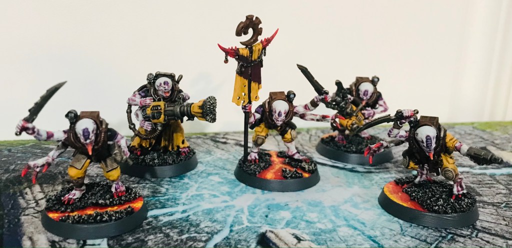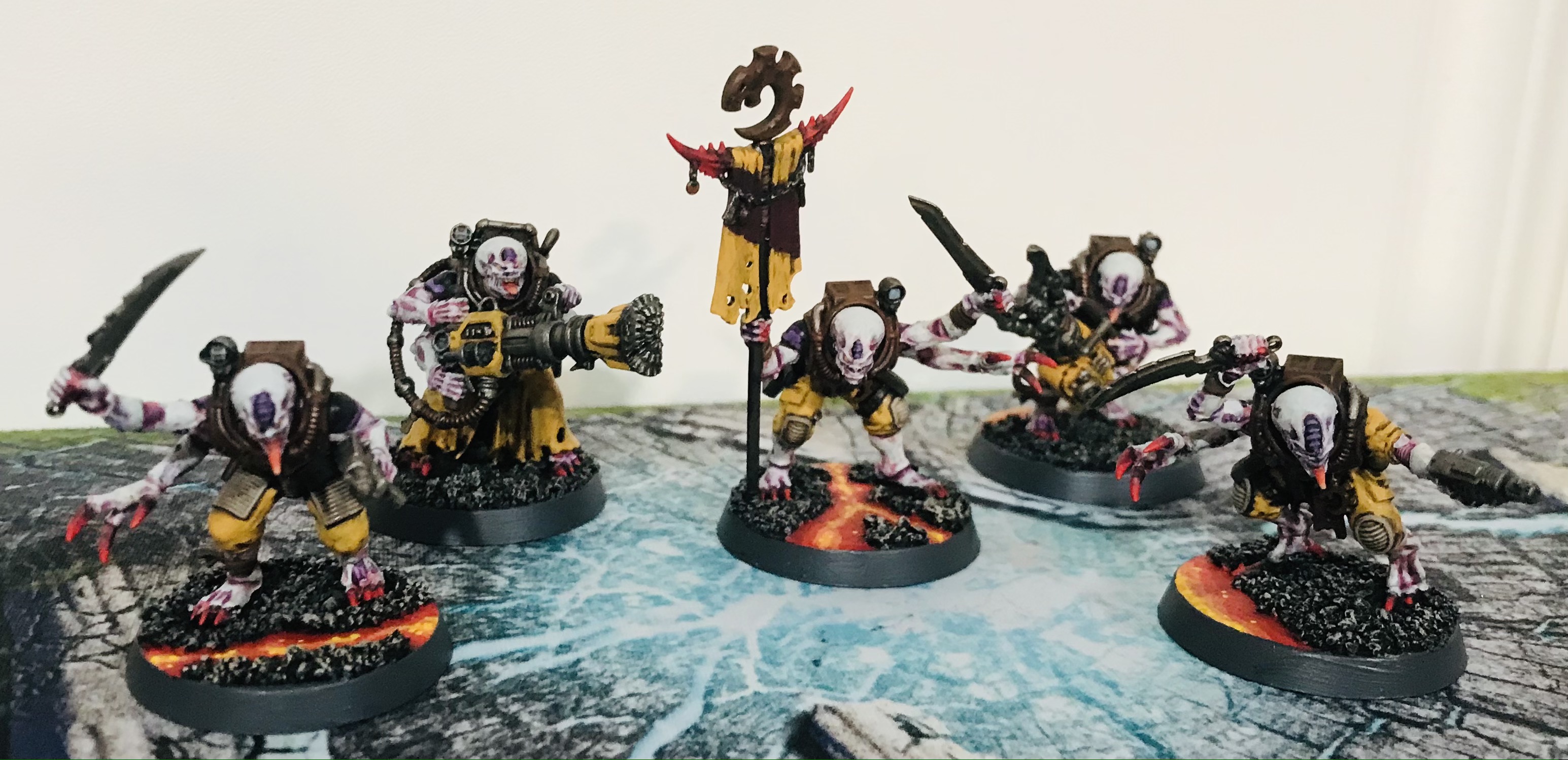 It’s been a long while since I tinkered around with Genestealer Cult and Tyranids for my 40k projects, but like the void-call of the Hive Mind it’s hard to stay away forever. Necrons are my primary focus (trying to keep it that way, hah). But still, always need to be brewing a few side-projects. Back with Shadow War: Armageddon, the set of skirmish rules that pre-dated Kill Team, I started up a Behemoth-themed set of gangs: one Genestealer Cult and one Tyranids proper. I finished squads for each, and was pretty happy about them. You can check out the color scheme here: https://leviathancult.com/2017/05/03/the-behemoth-approaches/ in full, but the pic below shows the generations as they looked.