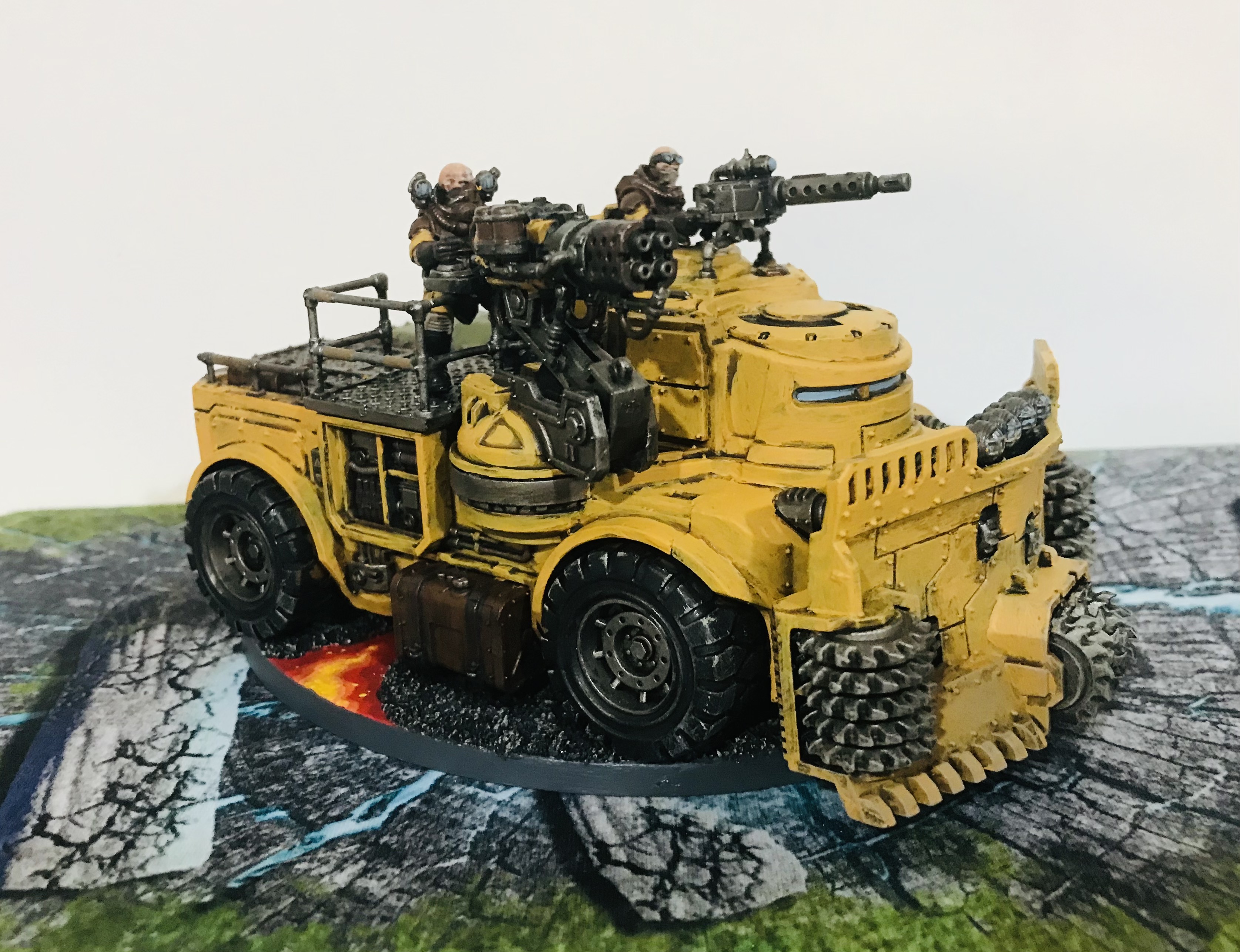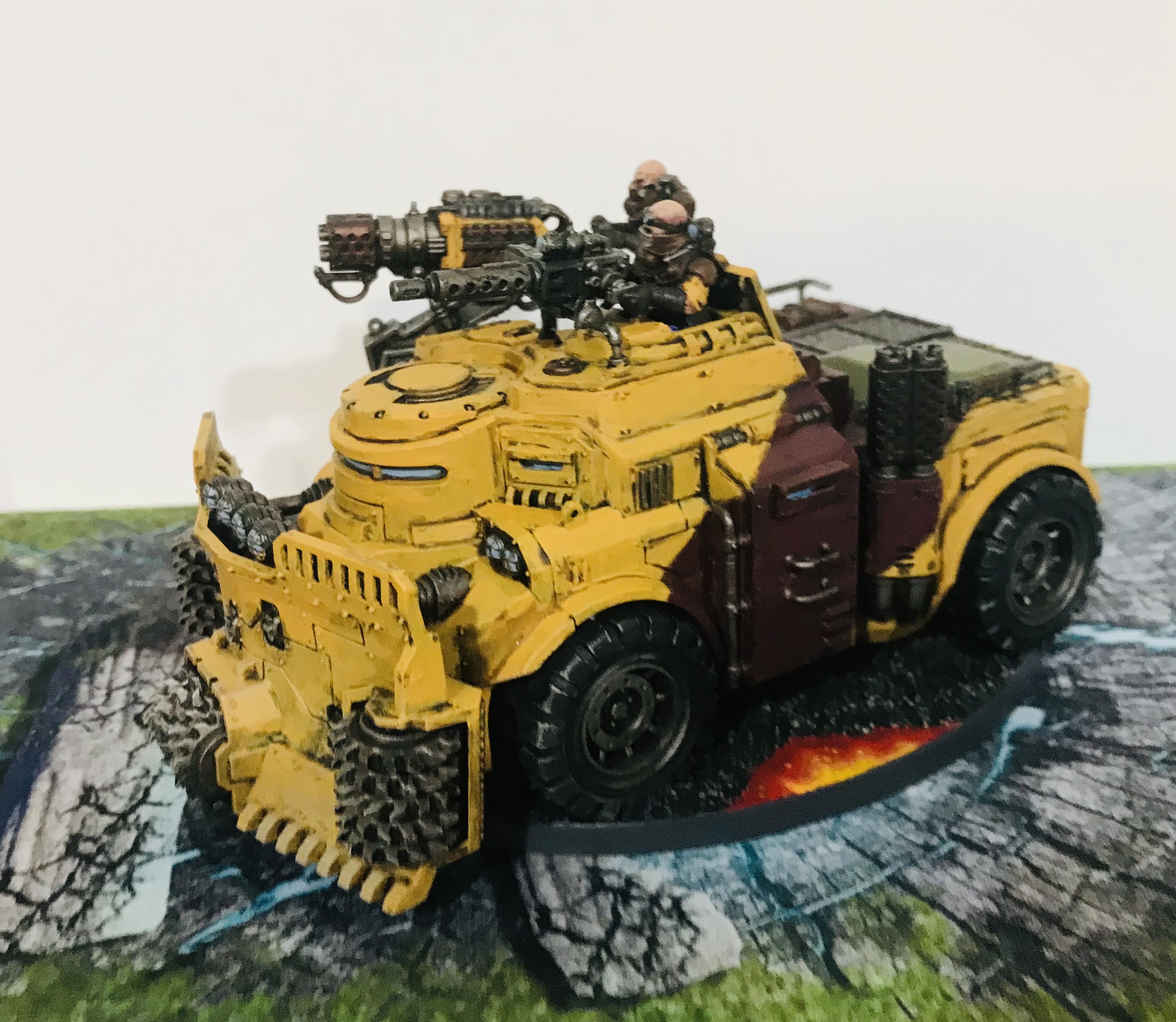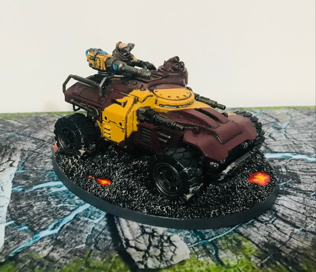 I’ve completed a Sanctus, a Goliath Rockgrinder, and my first Achilles Ridgerunner. Pics below. I’m doing all my vehicles with the stripe of the opposite cult color. Construction vehicles will be in yellow (burgundy stripe), while other vehicles will be burgundy (with yellow stripe).