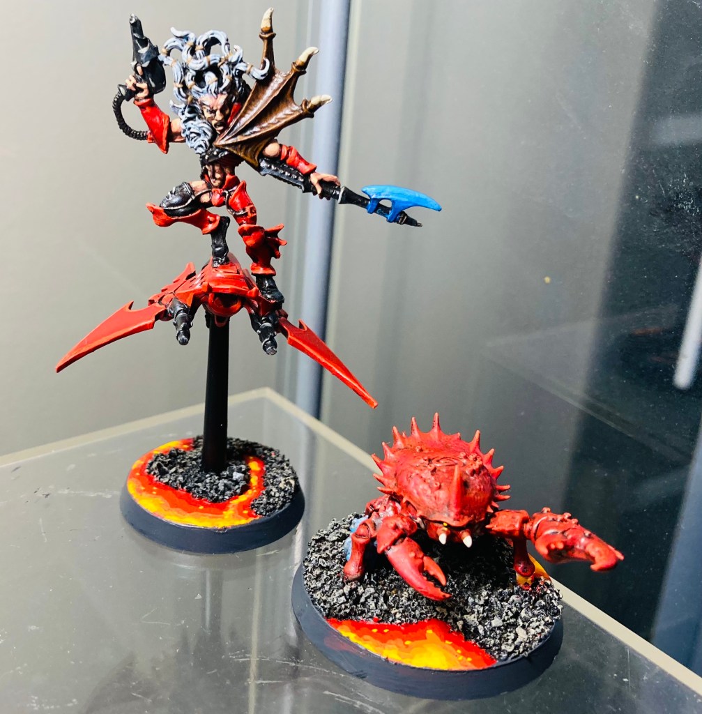 Archon Vÿr rushed forward, desperate to get into personal combat himself. He cut his way to a hulking Broodlord, and engaged it in extended combat. His strikes eventually overwhelmed the beast, and while it cut at him frequently and with deadly force, his Shadowfield held and he went unscathed by the beast. With enough damage inflicted on the leadership of the throng, the various smaller beasts started to wander, and the Drukhari retreated with a victory. Archon Vÿr felt confident–that show of force would make his raiders cleave to him. This was all going to go well.