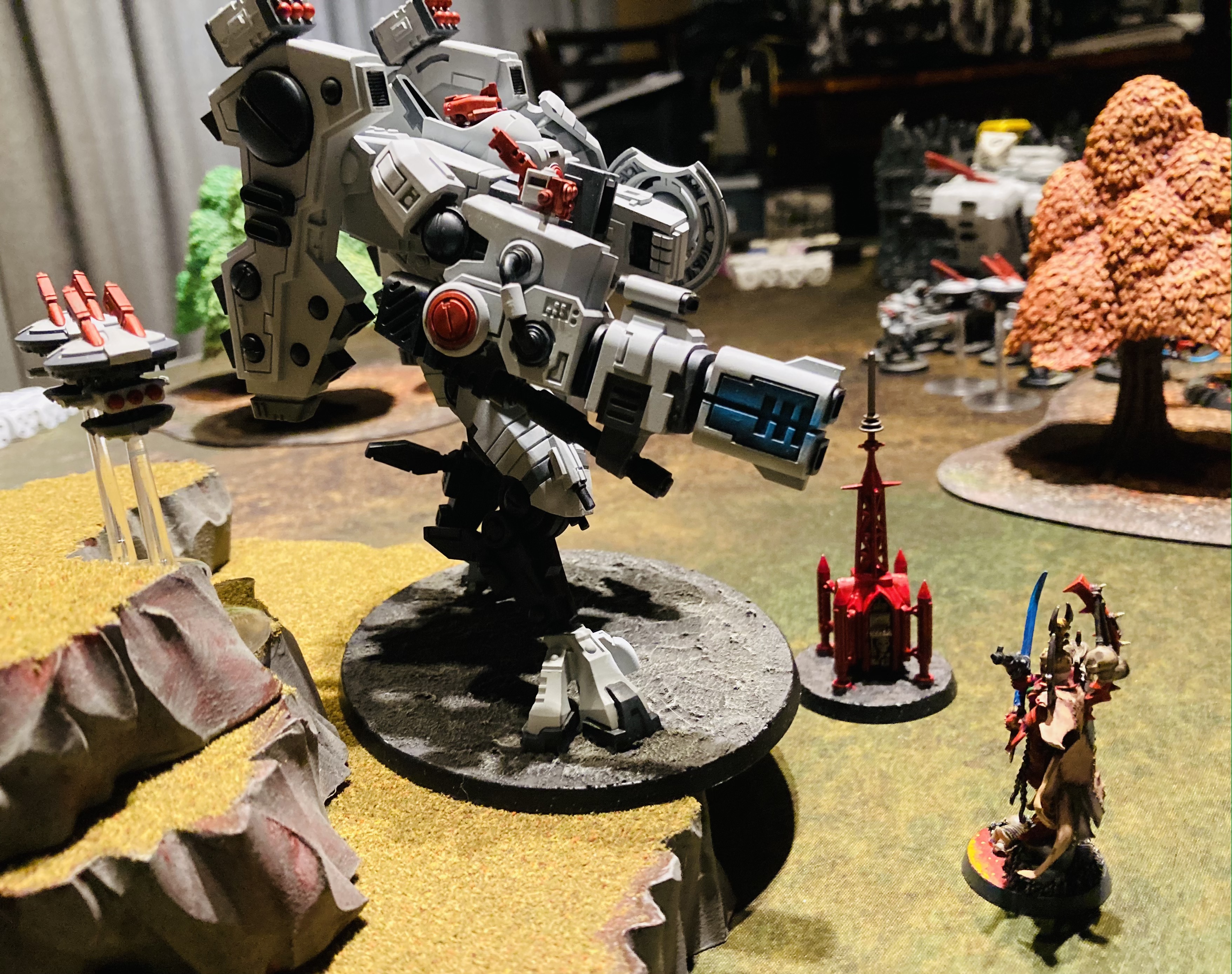 My initial starting area with the Drukhari was on Scylla Prime (as I was the LAST of the 15 players to get to choose hah), where my home base was the star port. That lets me more easily conquer tiles that are non-adjacent, so you’ll see in the first phase I spread my forces to take two other star ports: one on Glaucus and one on Phorcys, the newly revealed planet. Given that the Harlequins player Frank seized the Hive City on Phorcys, we’ve declared that “Elf Planet” and are determined to take more of it in the next phase (perhaps Steve’s Aeldari will be willing to help in the next expansion phase). I’m proud because at least my luck was strong on the planetary phase, and I’m currently holding 6 tiles (while every other force holds 5 or fewer). I’ve got my eyes set on expanding on Phorcys, because the lava paint scheme matches my basing of my models.