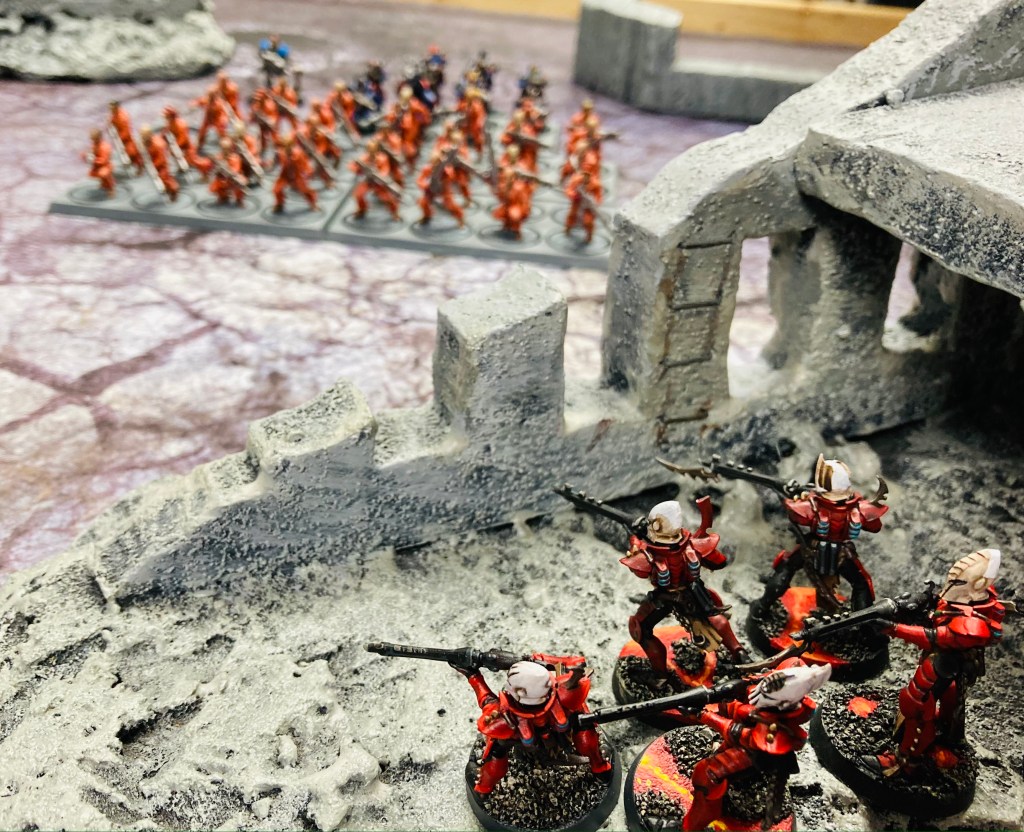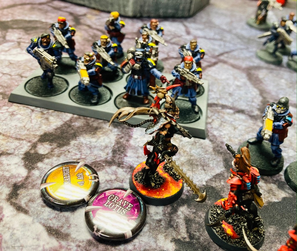 He set Succubus Maril’eth and her Wyches upon the regimental troopers, the ones who herded their own convict squads ahead of them. As expected, they had a fair amount more fight in them, and the Wyches took heavy losses–losing almost as many as they killed of the mon-keigh due to massed firepower. Meanwhile, Archon Vÿr strode confidently into the fray, his blade carving through the conscript forces.