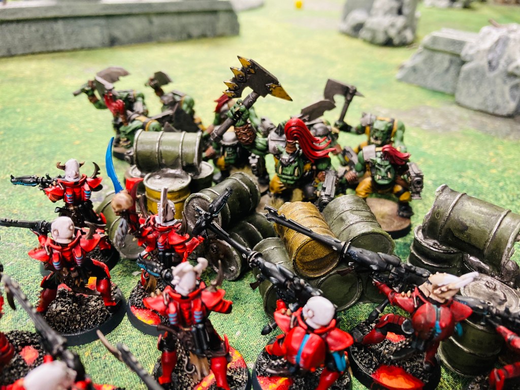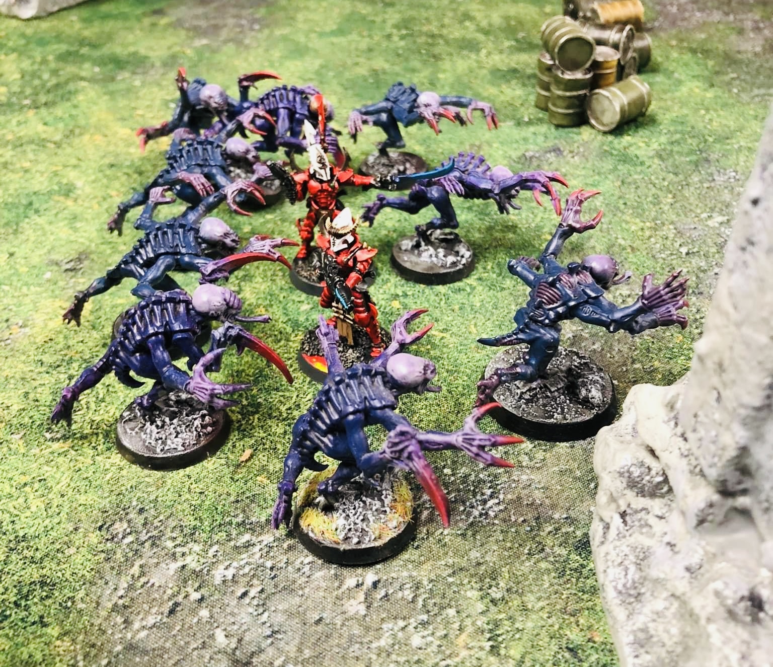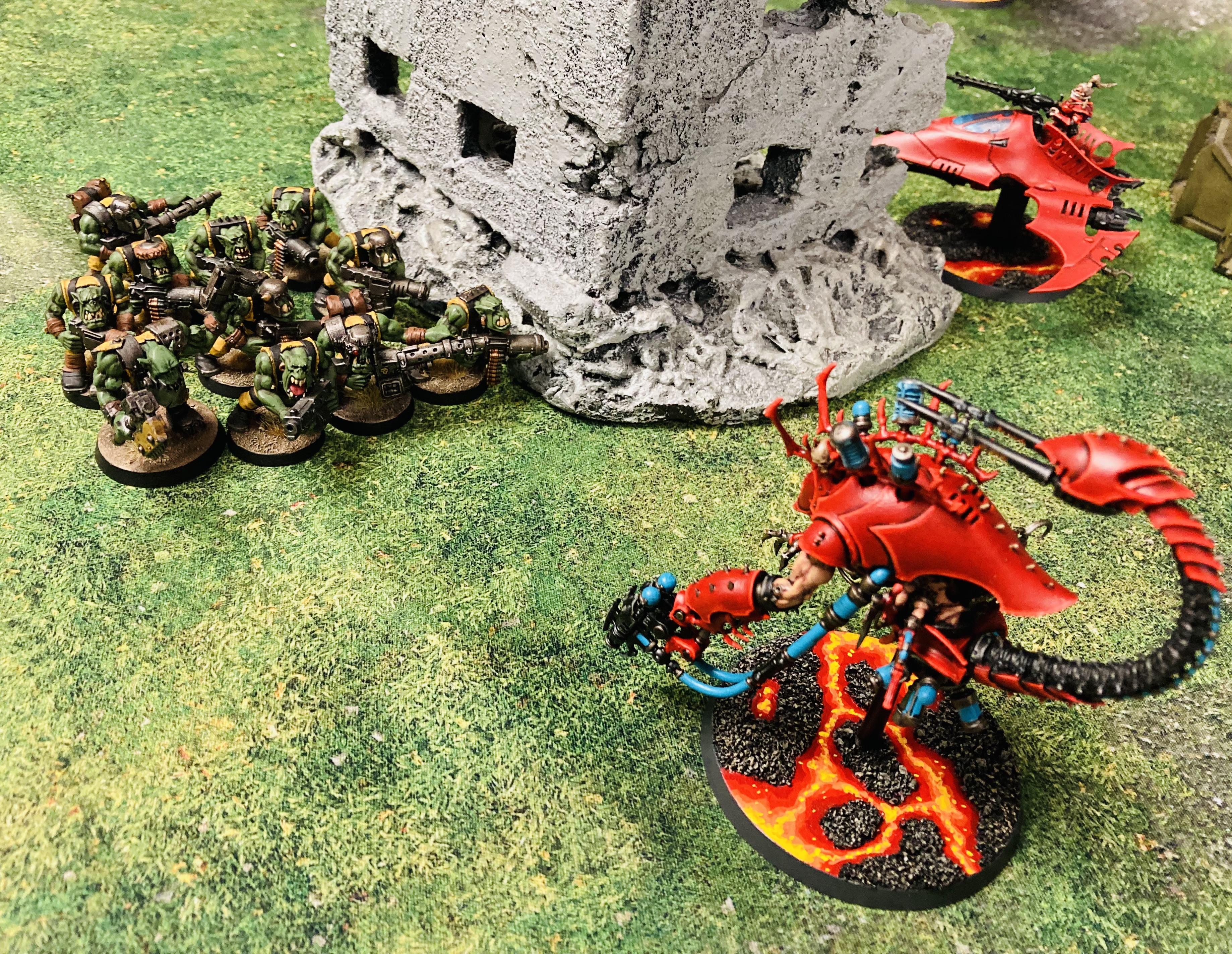 Archon Vÿr desperately needed easy pickings to satiate the rapacious tendencies of his forces, so he struck out to try and make a raid on a distracted foe. Noting a spot where the last remnants of the Genestealer Cult remained (must be a strain that did not share the same blood transfusions as the others he eliminated), he waited for them to strike at a rampaging Ork force that was in the area. His plan was to strike both sides suddenly when they were engaged, and make off with captives.