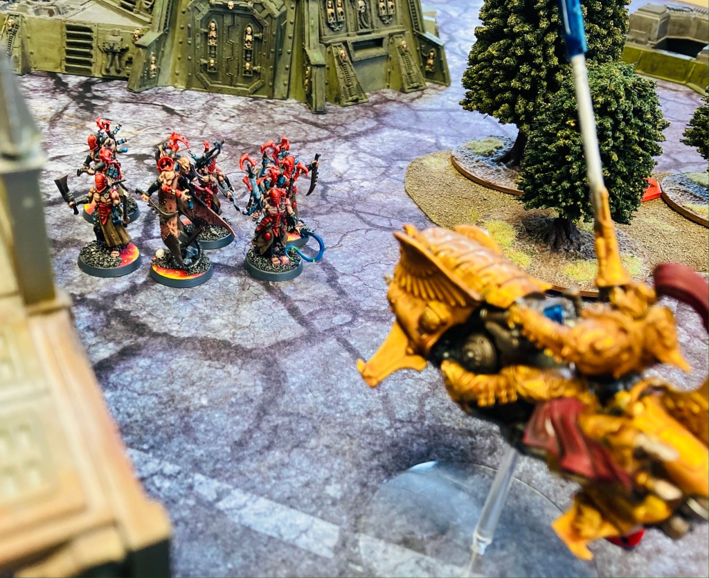 Much to Haemonculus Oribraq’s dismay, Archon Vÿr and his Kabalites managed to hold on to a victory through shrewd crowding of the foe. Only a single teleporting mon-keigh in golden armor remained at the heart of the battle near the end, his blows falling fruitlessly on Vÿr’s Shadowfield. With a laugh, he managed to intrude upon the space enough to disrupt the mon-keigh’s plans. The raid always had to strike then fade, and this time was no different. The mon-keigh were bested, and the Drukhari escaped with spoils from the community left un-protected by the golden warriors and their arrogance.