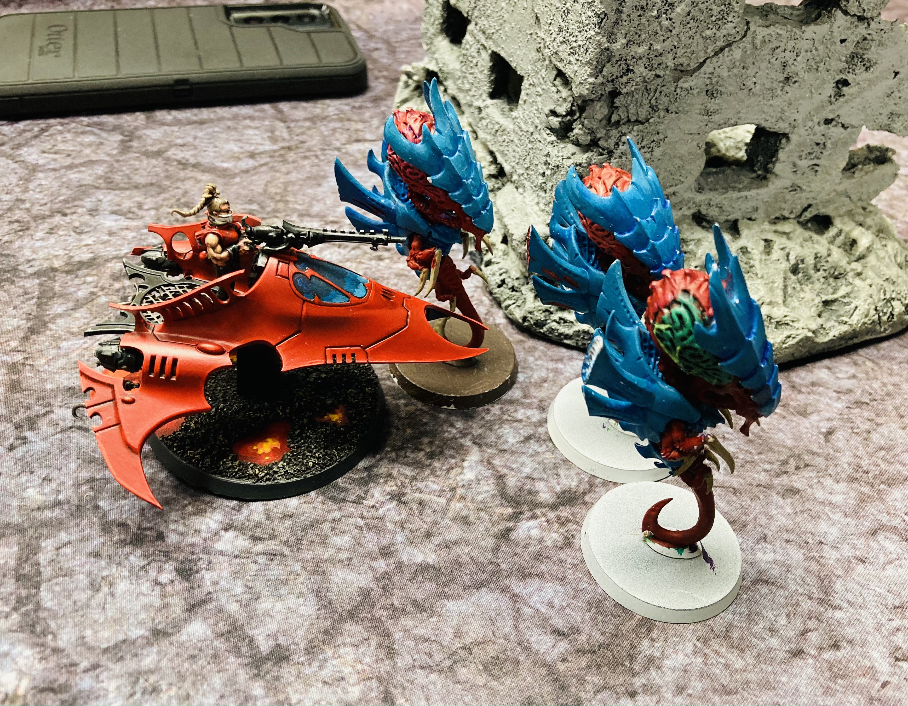 Vÿr had his forces stay at range best he could, even with his recent swell of bravado. These mon-keigh were almost no longer human, and worse yet, their bodies were so torn and broken that the damage done to them did nothing to help the Drukhari’s own souls in feeling release. At times clusters of splinter fire from the Venom and the Kabalites didn’t even seem to register with them when they pierced armor and shredded skin.