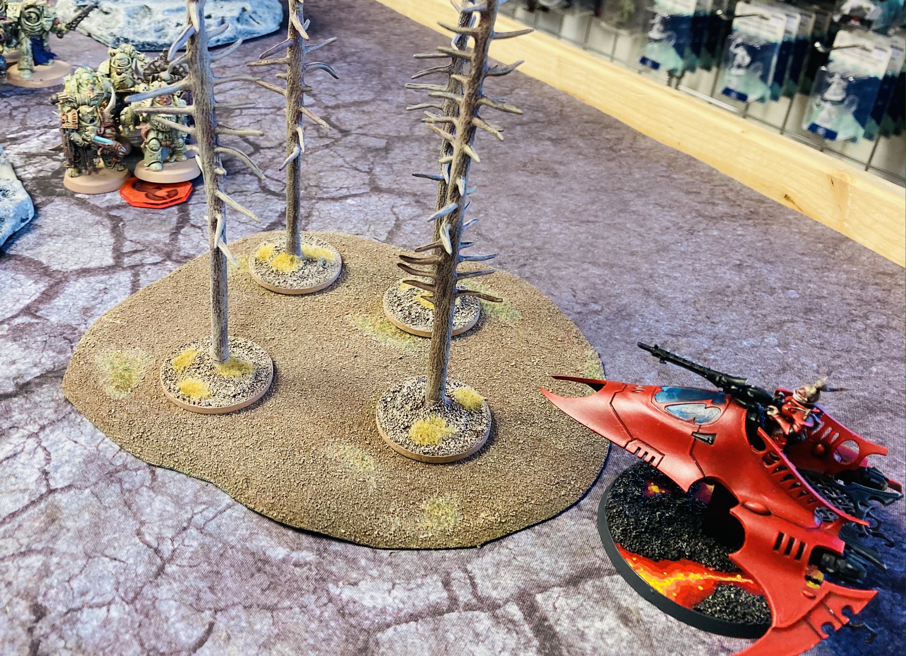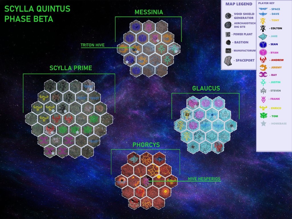 My initial starting area with the Drukhari was on Scylla Prime (as I was the LAST of the 15 players to get to choose hah), where my home base was the star port. That lets me more easily conquer tiles that are non-adjacent, so you’ll see in the first phase I spread my forces to take two other star ports: one on Glaucus and one on Phorcys, the newly revealed planet. Given that the Harlequins player Frank seized the Hive City on Phorcys, we’ve declared that “Elf Planet” and are determined to take more of it in the next phase (perhaps Steve’s Aeldari will be willing to help in the next expansion phase). I’m proud because at least my luck was strong on the planetary phase, and I’m currently holding 6 tiles (while every other force holds 5 or fewer). I’ve got my eyes set on expanding on Phorcys, because the lava paint scheme matches my basing of my models.