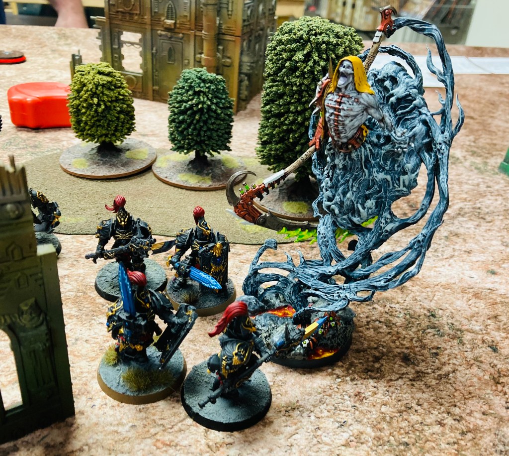 Again, Sebekh deployed the Nightbringer shard, this time to delay and confound the enemy with its strange permanence. Eventually it was smashed down by their forces, their blades finally taking their toll. The leader of the mutant monkey-forms continued to fight on, and Warden Nesos had withdrawn the Warriors to use their gauss reapers on him rather than continue the fight. Which was the window the warrior needed to attack Sebekh himself. The leader was lightning-fast despite his bulk, and Sebekh quickly realized he was outmatched in melee. “I guess I watch this one from afar,” he said, and recalled himself to the Tomb Ship while slaving his consciousness over-ride to the Doom Scythe so he could keep viewing the assault. The monkey-form leader seemed to do much the same with his own teleportation matrix that must be embedded in his armor, as a fusillade of tesla fire from the Immortals found weak points in his armor thanks to sheer volume.