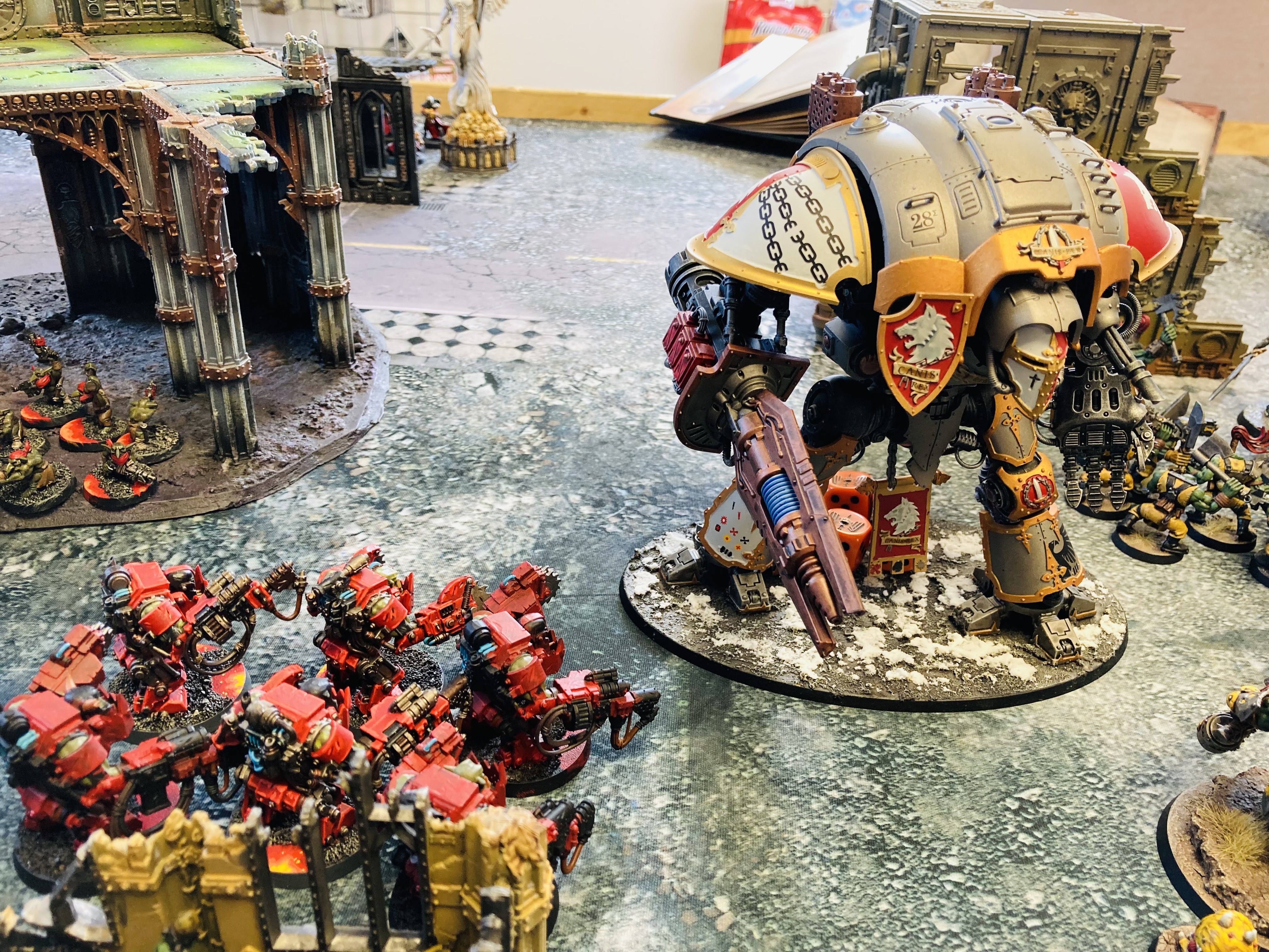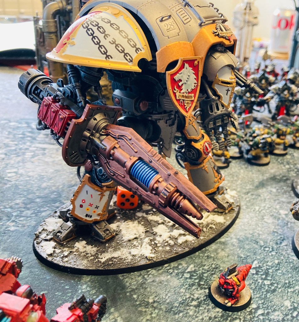 The Space Wolves were joined by a Knight, Canis Rex, a freeblade Knight piloted by Hekhtur Cereberan. Hekhtur had been working with the Space Wolves to find an enclave of Iron Warriors heretic marines and extinguish them, when the call to defend the Shrine world came. He gladly accompanied the Wolf lords to the surface to lend his Knight’s might against the Ork menace.