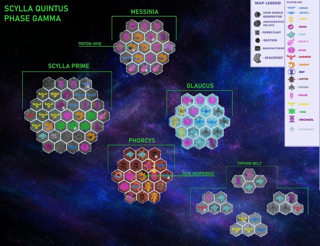 Another set of Planetary Empire games with the Orks. Making big gains for Orks on the main map, though honestly it’s in large part due to our other player in the Campaign Enrico (whose Bad Moonz have some serious territory). My Goffs in red are at least foot-holding two asteroids and the big planet.