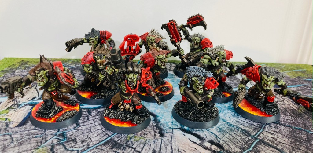 Next, finished a unit of ten Beast Snagga Boyz. Really showed me how the red colors will look balanced with more natural colors and skin tones for the orks. There’s always the danger of the Christmas curse with this color scheme: green and red and white accents. But I think I dodge it really well with these.