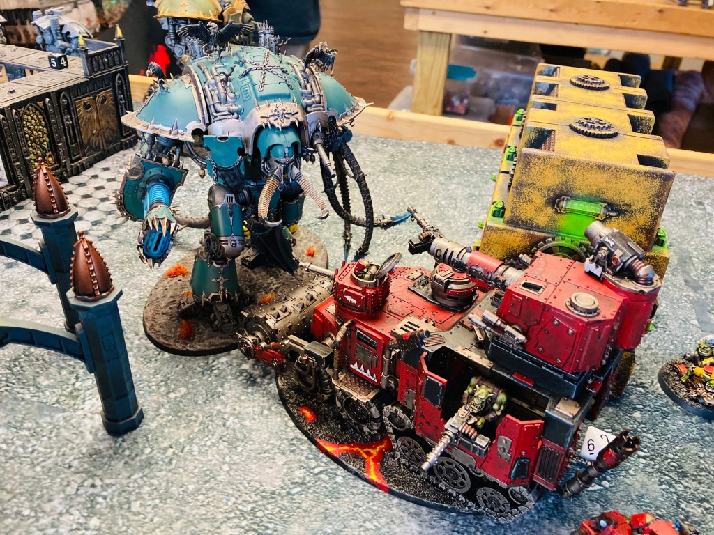 Such was the vengeance-fueled fury of Warboss Drozgurk that his forces actually cooperated effectively, and timed their assault into the Knights in concert. Wave after wave of Meganobz, the massive battlewagons, and Beast Snagga Boyz all took their choppas, saws, and claws to the assembled Knight forces. Two Knights and an Armiger all fell in the same wave, the catastrophic damage taking even a few Ork casualties as they exploded upon being torn apart.