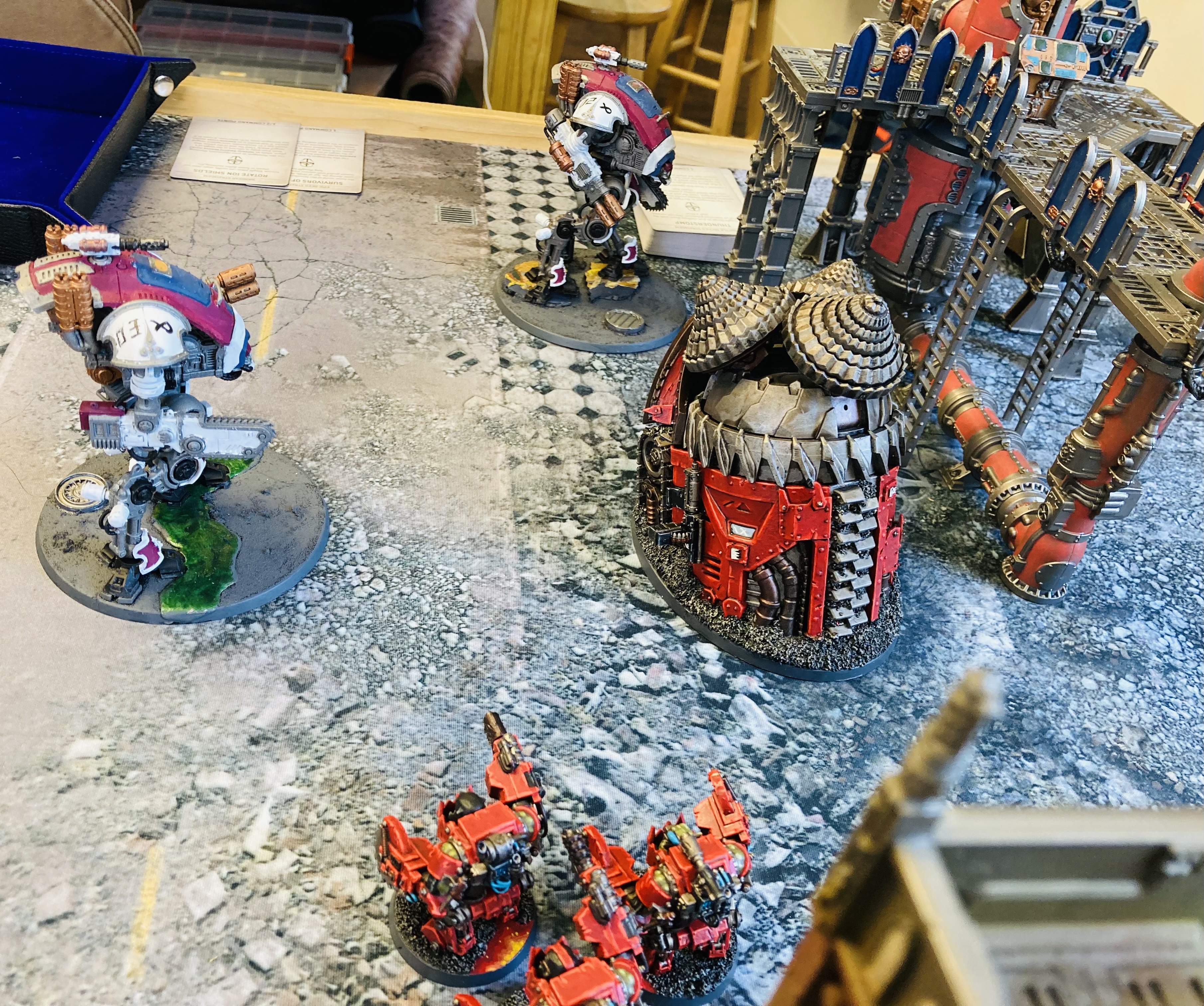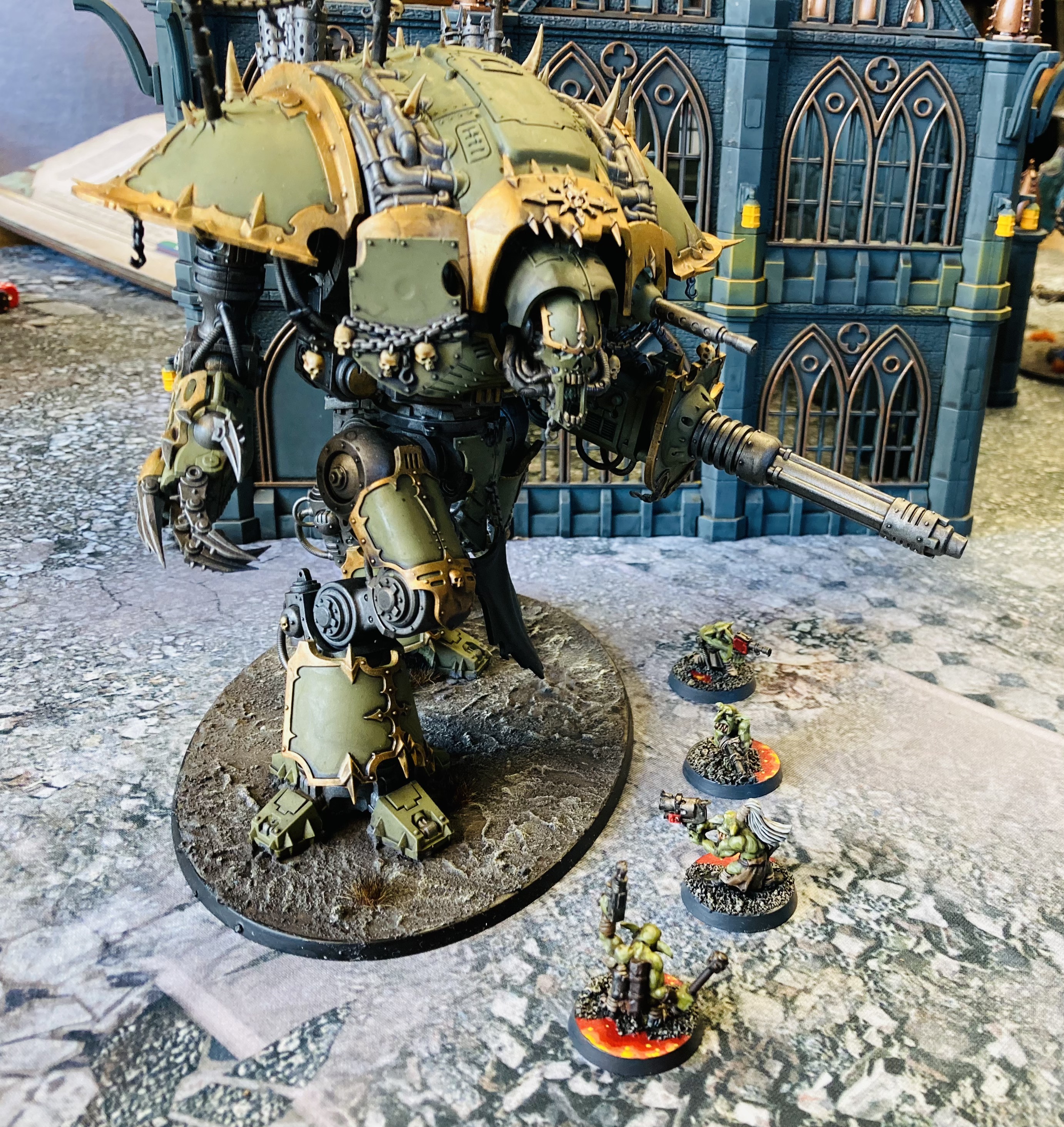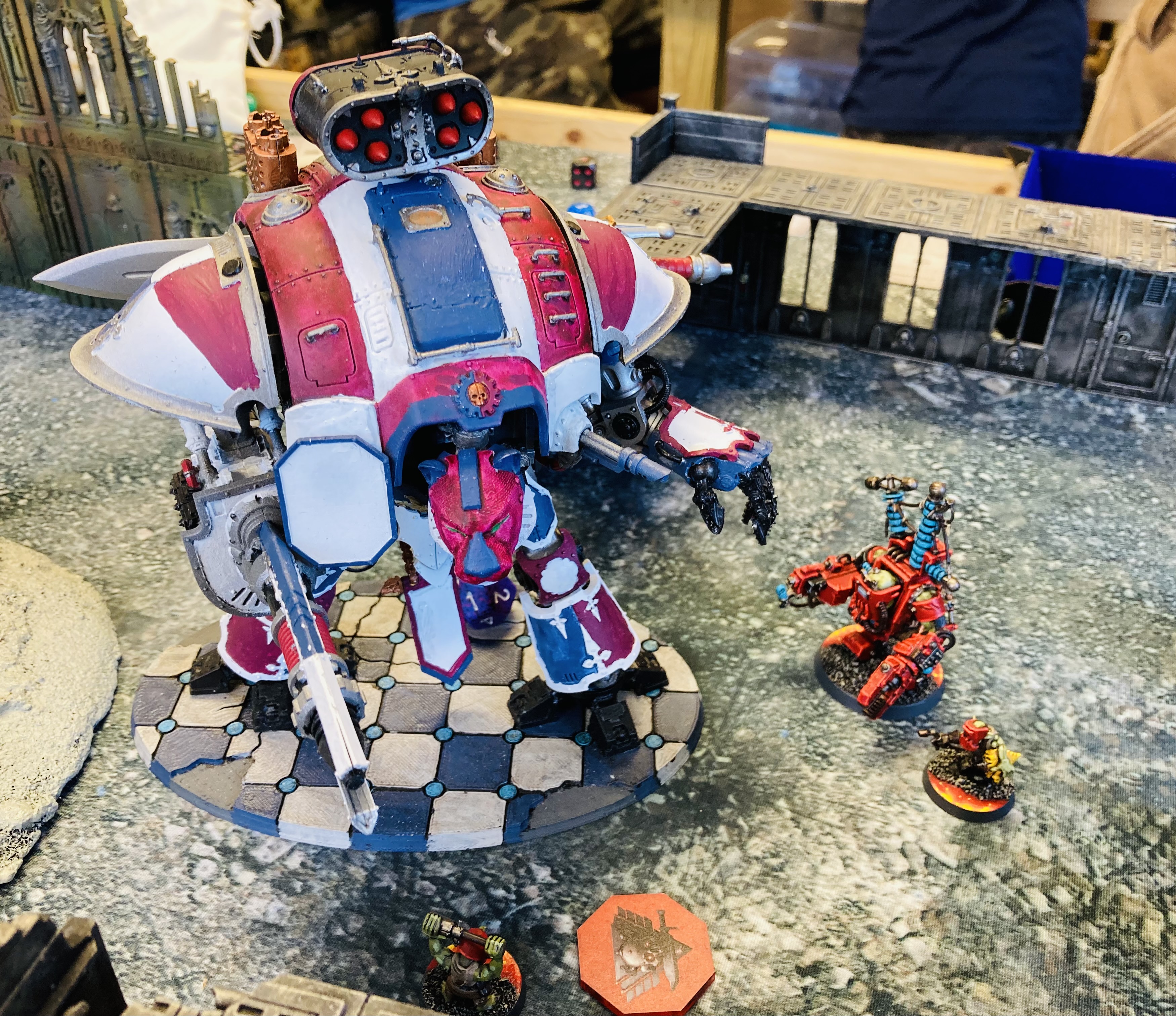Unfortunately for ‘Eadfragg he didn’t quite grasp the tactical situation, nor did he see the Armiger Helverin approaching him from behind and ranging in its twin autocannons on his form. With a blast of rapid shells, ‘Eadfragg’s celebration quickly became a situation where his grot orderly was dragging his shattered body away from the smoking crater that remained.