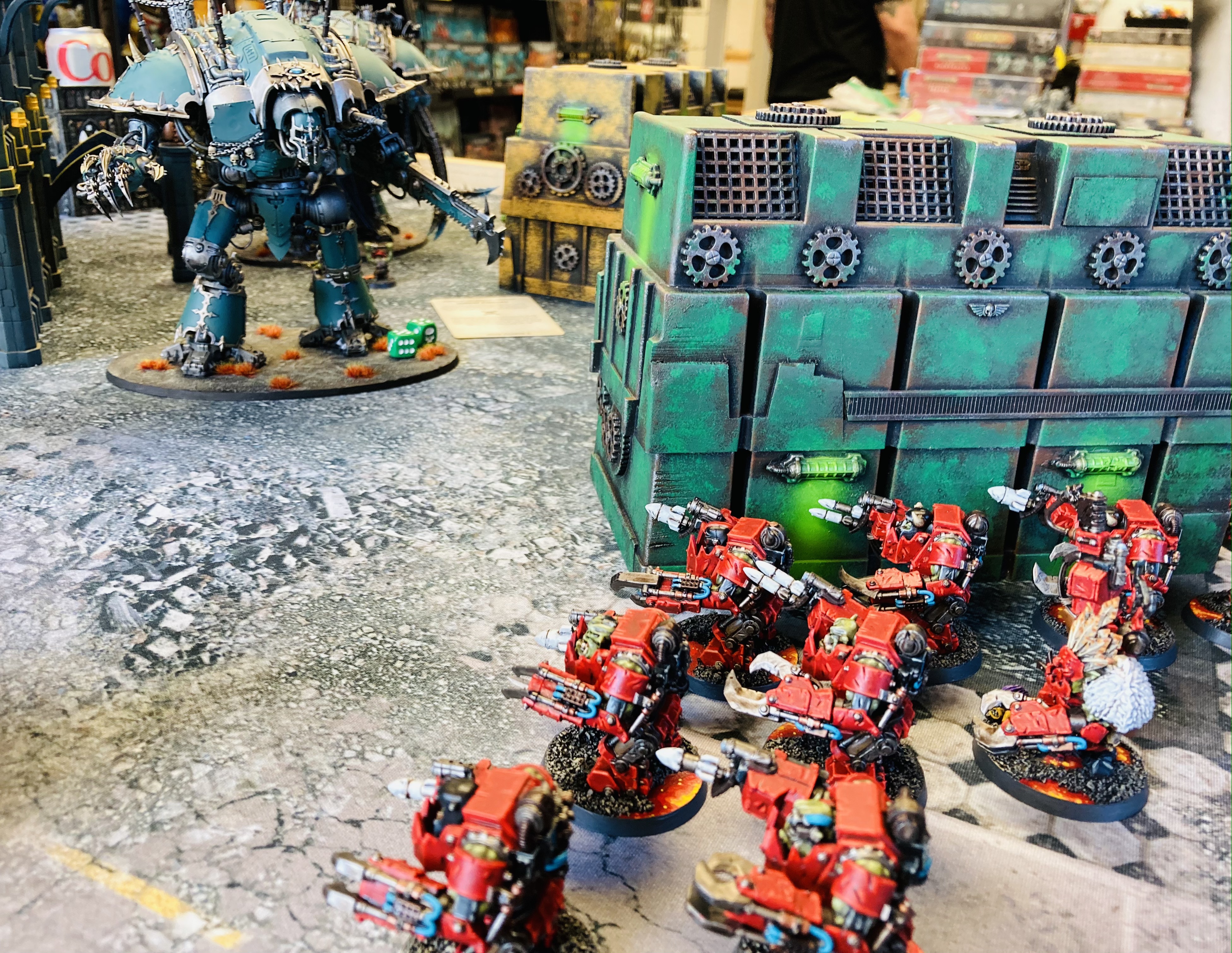 Waves of Gretchin were summoned from the crews of vehicles and sent forward to be a picket screen against the big warsuits. While the Gretchin were cut down in droves, the main line of Drozgurk’s forces–hard units like Meganobz and Battlewagons–prepared to strike. His main Meganobz mob, now with a few new Nobz who had looted mega armor during the last battle, unloaded salvos of rokkits that started to detonate into the massive Knights. While the armor could take some assault, the sheer volume of explosives started to make a dent.