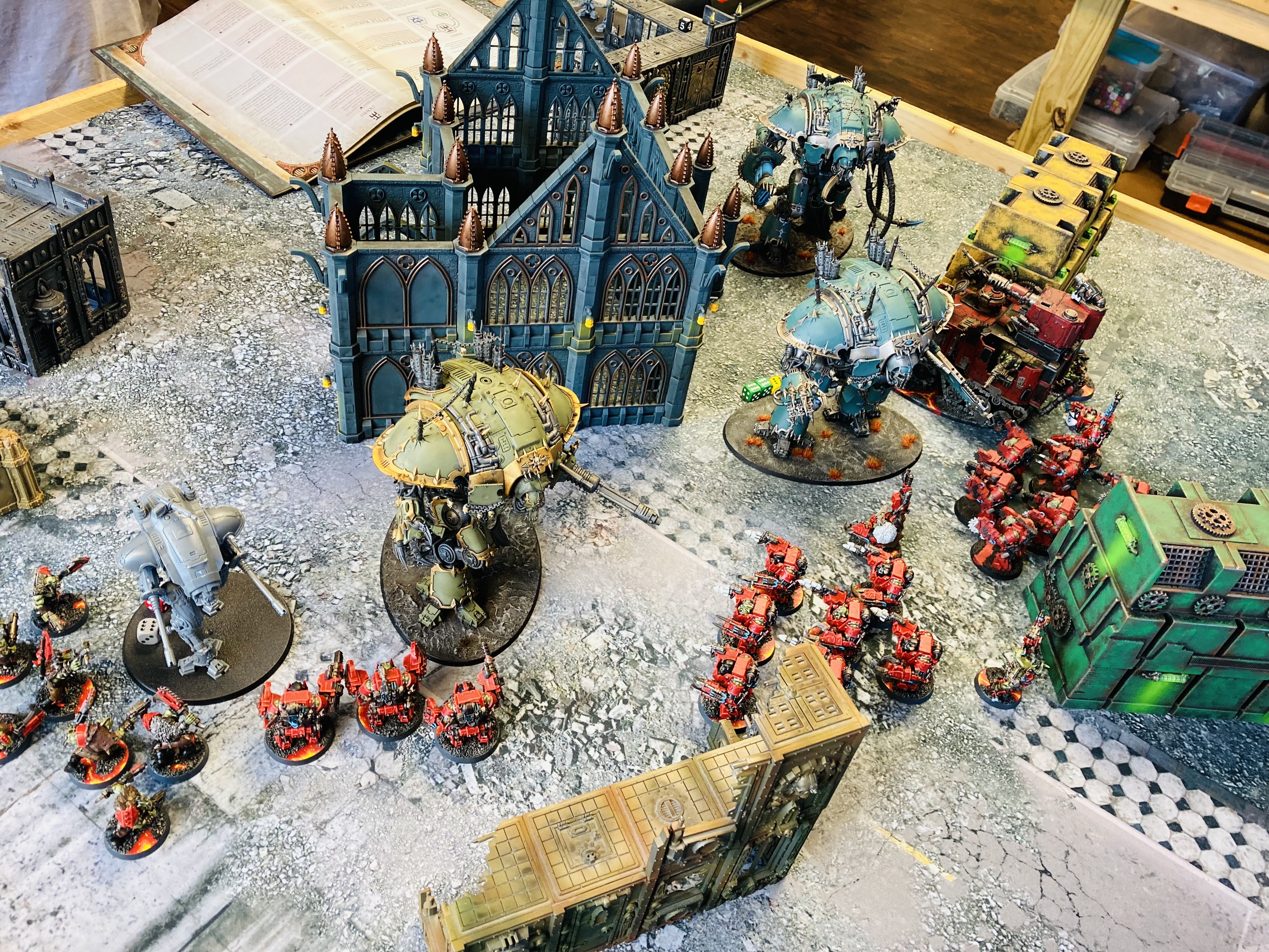The larger Knights followed the smaller, and that’s where the Ork lines simply broke. Scores of foot troops and the elite Meganobz both suffered under their fire and titanic assault. Big Mek Ursatz tried to support the forces, only to watch wave after wave torn apart by one of the Knights. He took a swat from the thing’s massive powerfirst, which knocked him clear across the ruins where they fought to collapse in a heap under the rubble.
