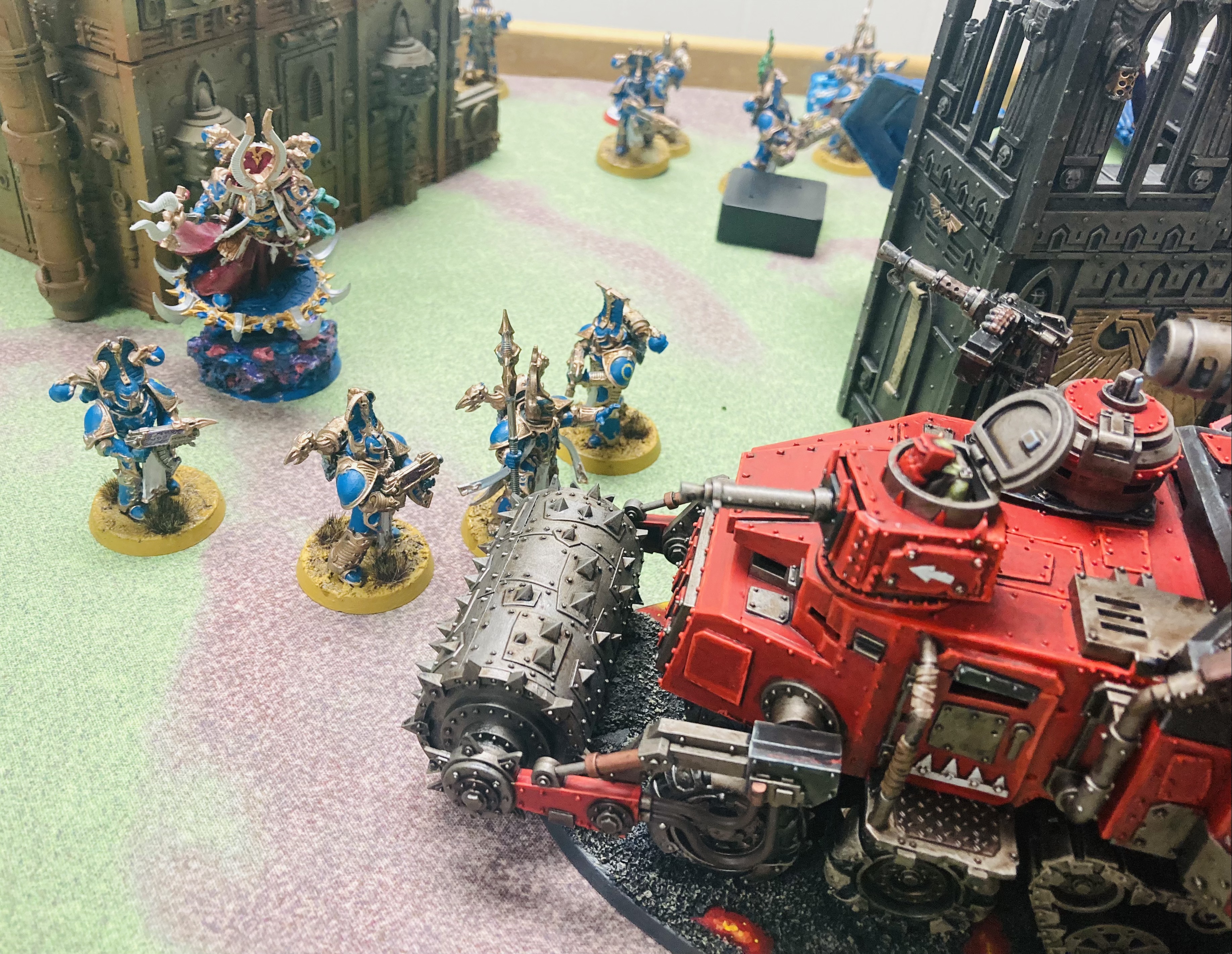 The Thousand Sons struck when the Orks were re-arming themselves in a small abandoned research facility in the plains of Scylla Prime. Ancient Thunderhawks landed groups of their warriors at range, who immediately started the barrage of their deadly fire. Initial fire inflicted some casualties, but it was the Battlewagons that drew a great deal of their fire–and while the great war machines were damaged, they kept rumbling forward. One of them reached the Thousand Sons lines, where its massive Deff Rolla crushed more than a few of the slow-moving ancient suits.