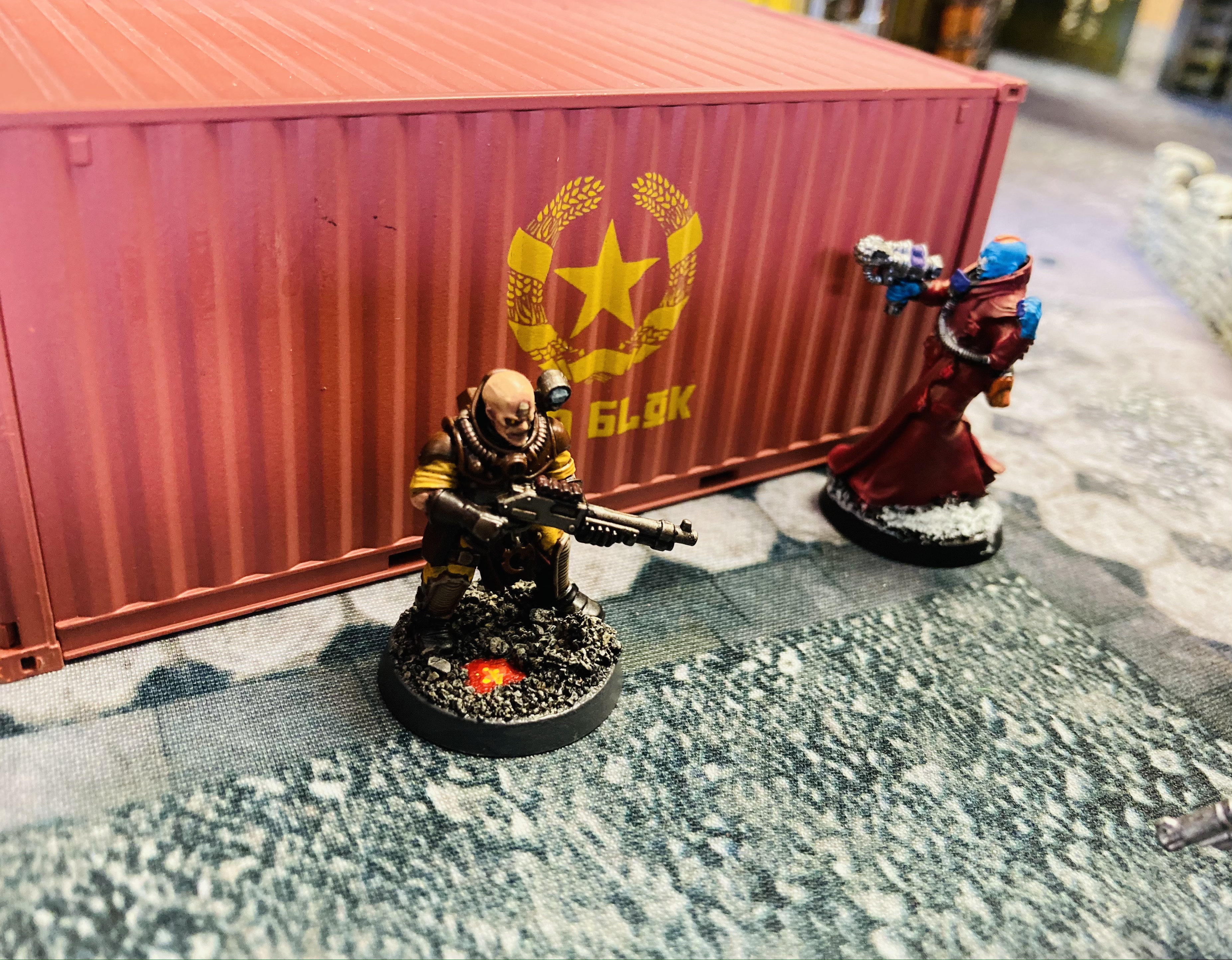 I got in two games of Necromunda, one against Tony’s Delaque squad, and the other a three-way match between my force, Tony’s Delaque again, and Ryan’s Enforcers. Tony won the first as I was down some of my best crew members from my first match. I won the second as Tony’s and Ryan’s forces beat up each other, and I sort of swept in after and cleaned up.