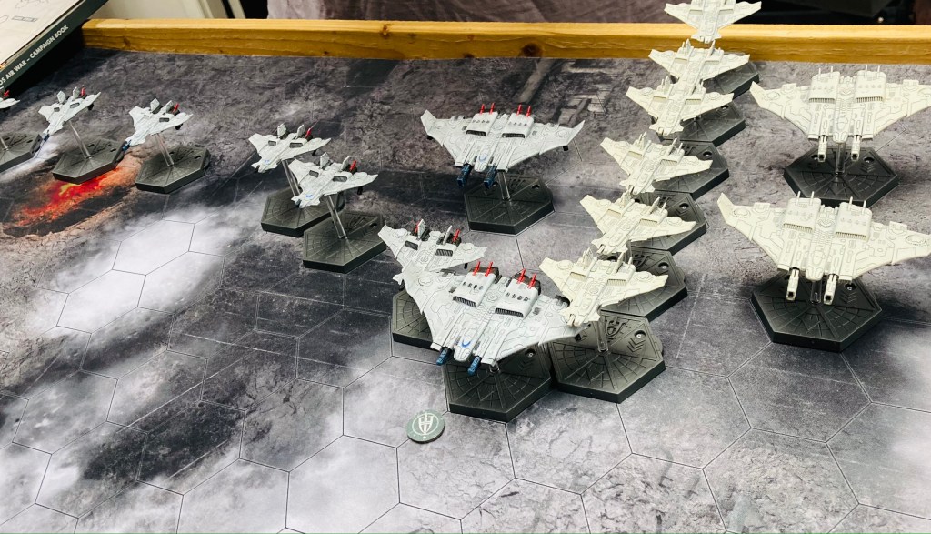 This is the first game of our “Invasion of Planet No’ohrm Ha’an D” series of battles. The prior fluff is here: https://the-dark-muse.com/2023/01/02/the-invasion-of-planet-noohrm-haan-d/ and the rules for the mission are here: https://the-dark-muse.com/2023/01/11/assault-neo-normandy-missions-1-strategic-air-war/. Next game will be a second Aeronautica Imperialis mission–a bombing run against strategic infrastructure.