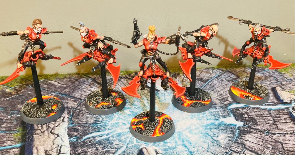 Finished up a group of five Hellions–the first of many (many). These are fun to paint, and I’m glad that I had the practice of doing my Beastmaster on Skyboard conversion and my units of Wyches before tackling these.