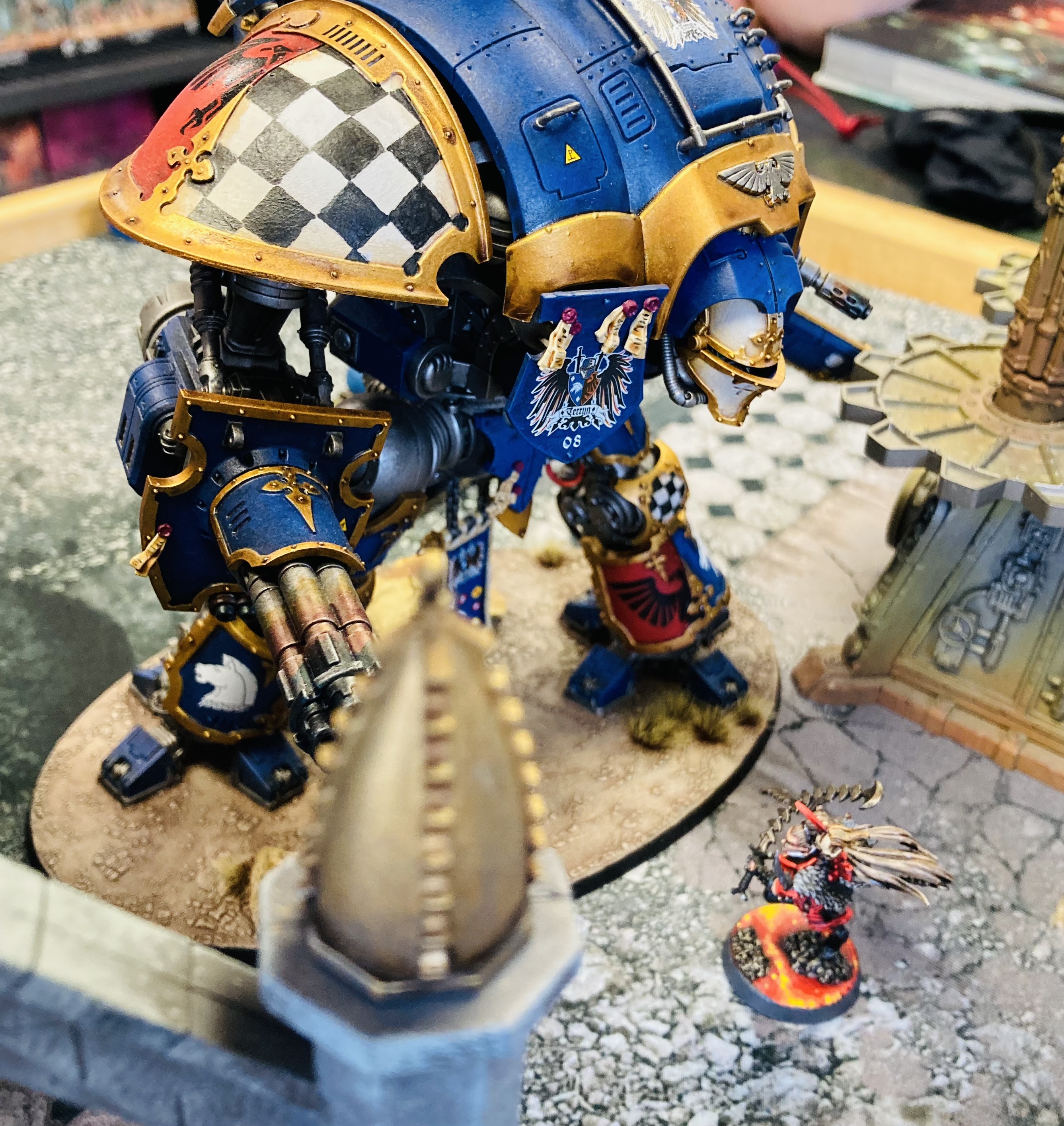 Yraleath’s Ravagers had their sights full with the Imperial Knight that supported the Ultramarines, doing some damage but ultimately falling to the firepower of it and one of the Ultramarines’ ancients encased in dreadnaught battle armor. However, an ambitious young Succubus that Yraleath had recruited was not deterred. Even while the squad of hypex-drugged Wyches she led were gunned down by the lumbering titan upon approach, she herself laid into it with an asburd fury. The slicing fever of her Tryptich Whip landed mortal blow after mortal blow on the massive warsuit–and while there was a good amount of luck that was included in her success, her nasty precision with her swirling strikes and deadly weapon was sufficient to just barely down what remained of the titan. Yraleath made a note to watch her in the future–as an ally and as a threat both. Maybe he should give her an impossible task… hmm.