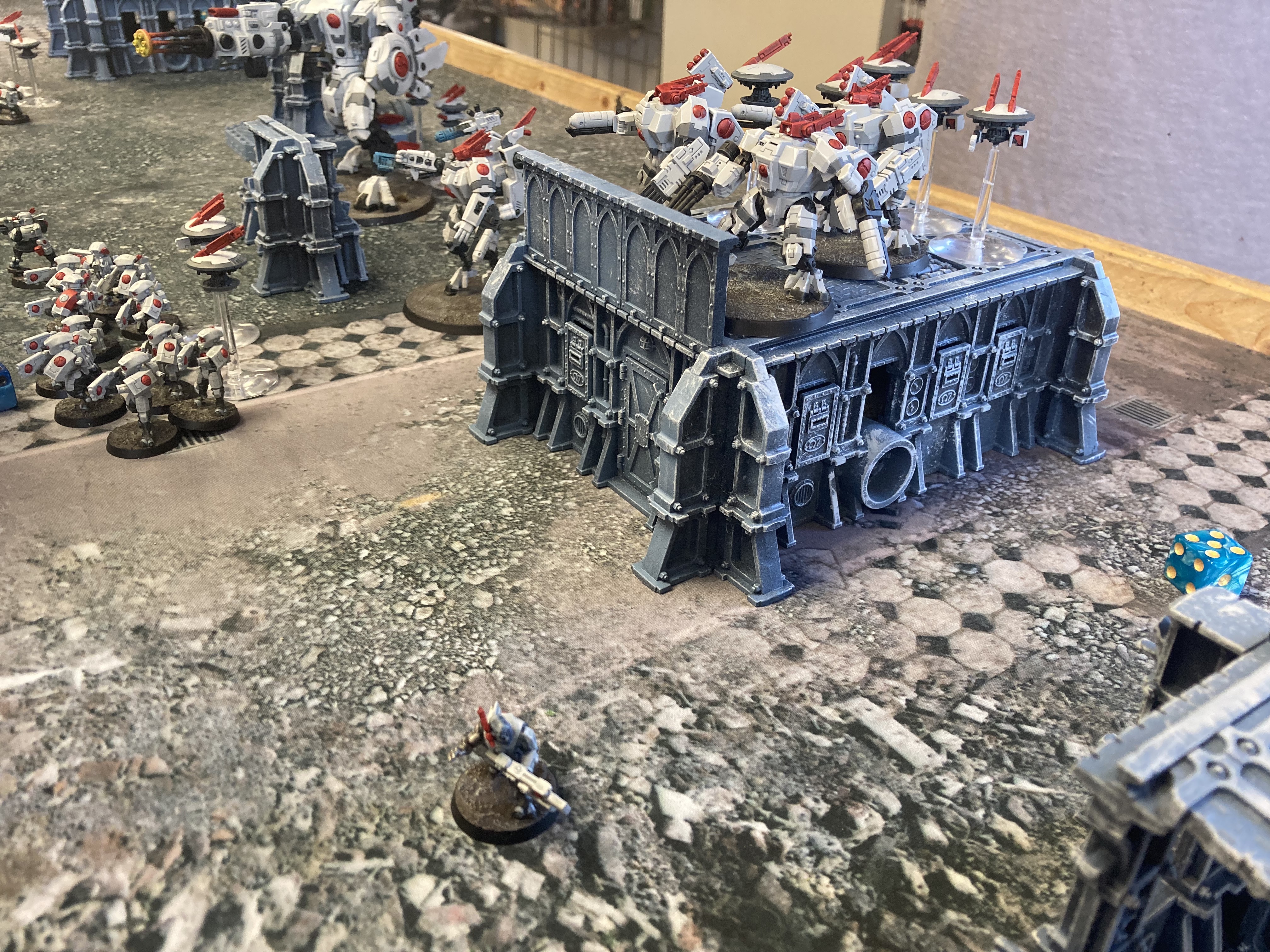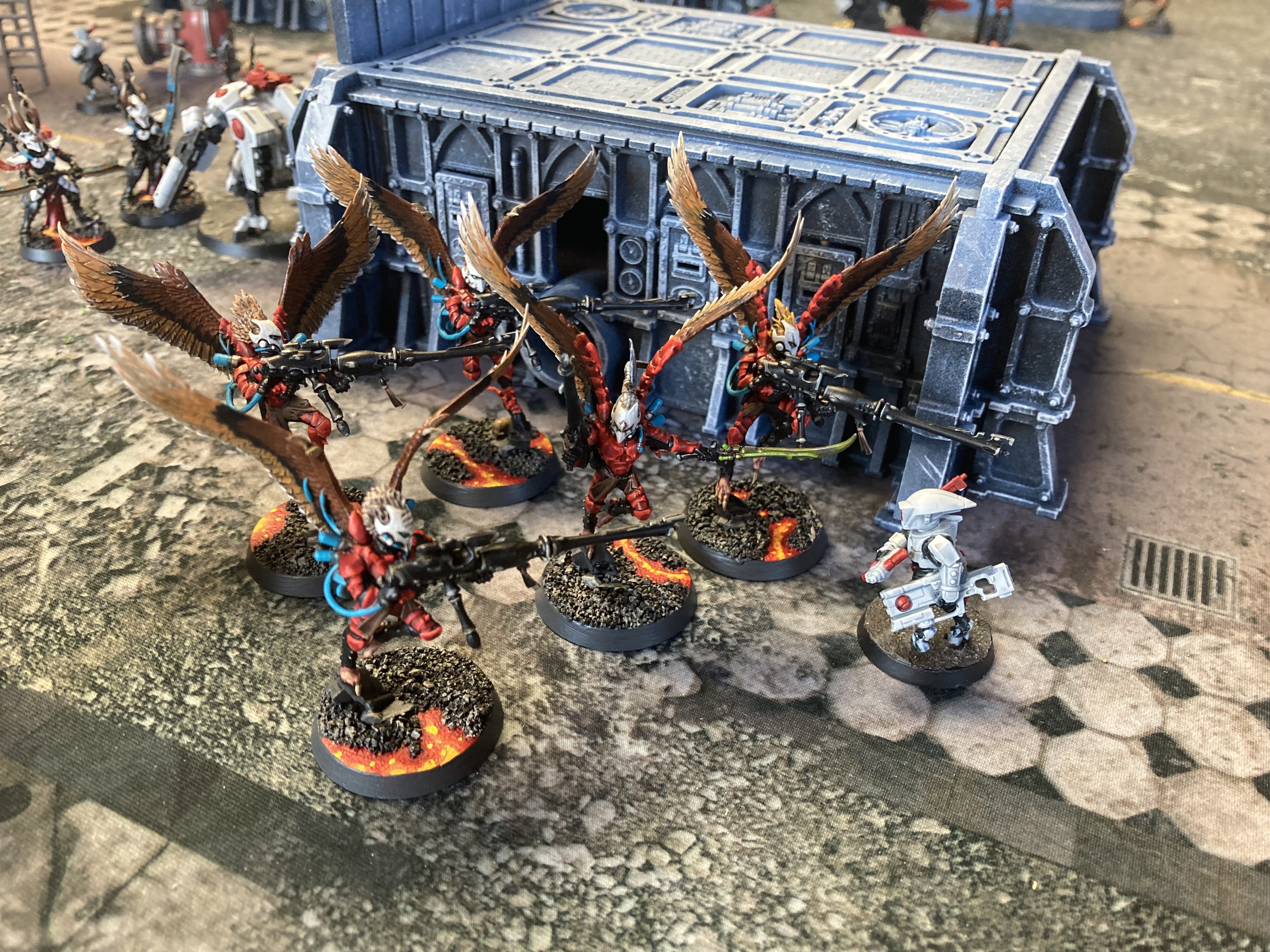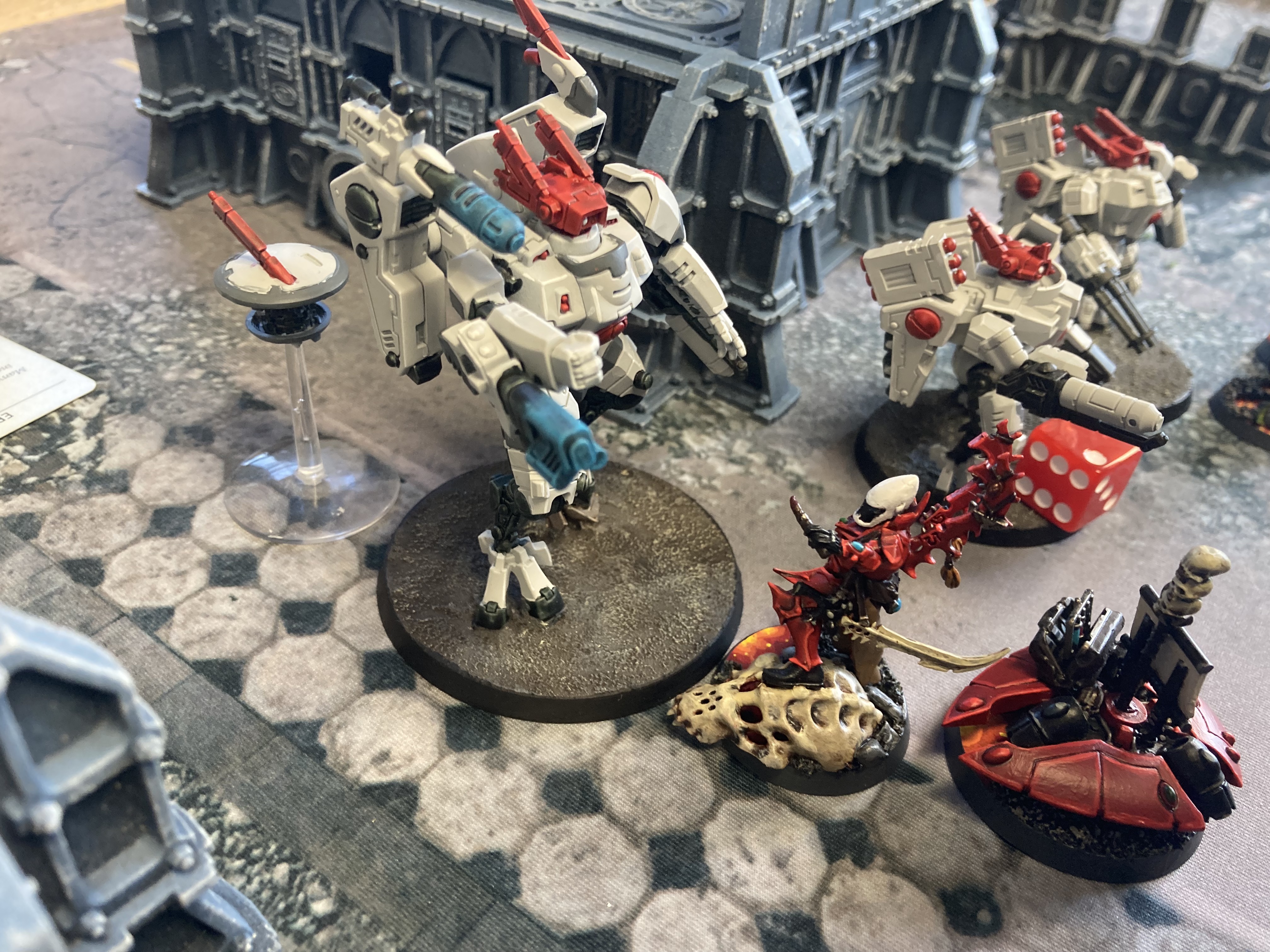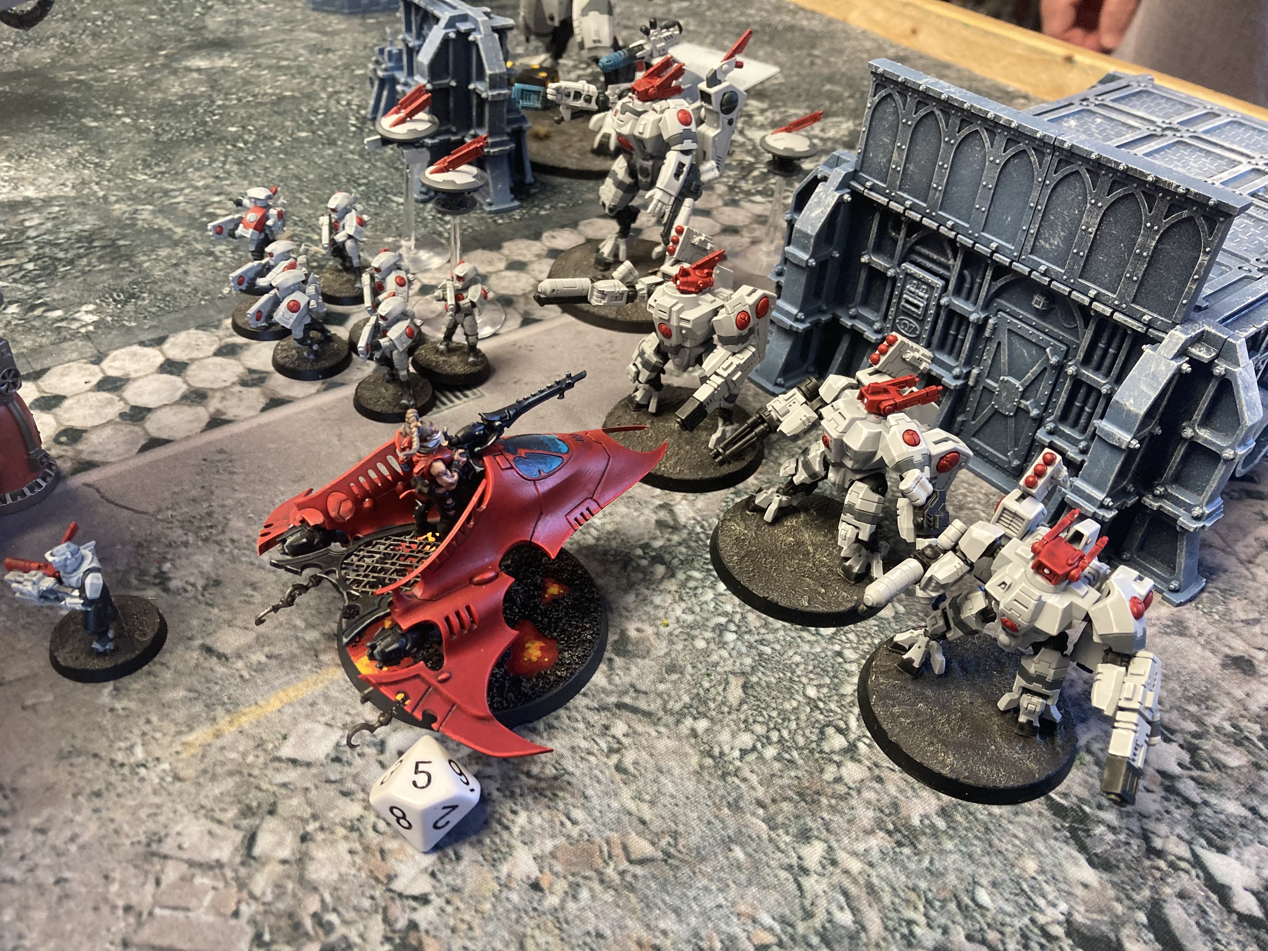 The battle was close amidst the barracks sector, where the Drukhari and Tau were near-even in exchanging destruction with each others’ forces. The Drukhari way of war was elegant but cruel, and they chanced far too much at seeing the destruction in the eyes of their prey up close. On her Craftworld monitors she saw much more orderly advance: Falcon grav tanks landing aspect warriors into cover to slowly make their way forward with suppressing fire. She honed in on a bright spot: a unit of Fire Dragons had downed one of the big suits, but was pinned down into cover and losing members from the ranged fire response of the enemies.