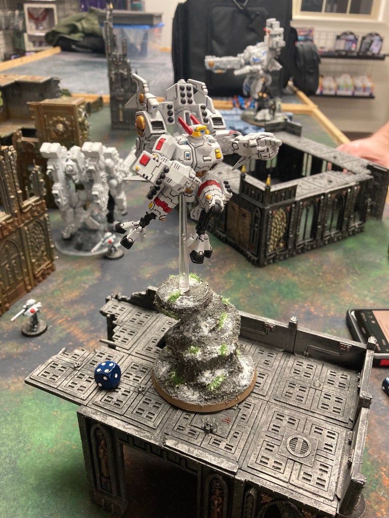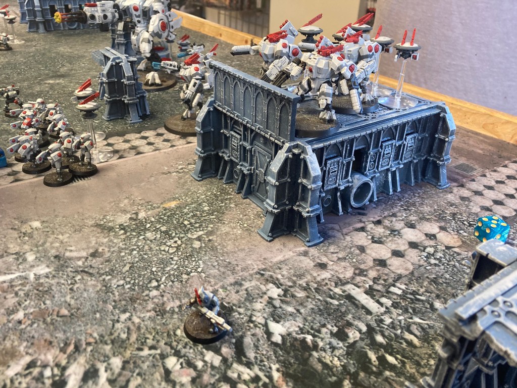 Alerts started to sound, as in both drop sites the Tau commanders were taking a toll on Aeldari forces. Some of the most capable warriors on the Tau side were engaging with precision and destructive armaments, landing devastating damage onto the Aeldari forces. One feed caught a Tau commander surging forward on jet propulsion, his missile pods blasting into the terrain where the remaining Fire Dragons were hunkered. While the commander inflicted damage, the loss of all of the larger suits started to be felt and Baranyl responded to the tactical command from the fleet “target complete: withdraw to safe engagement range” by passing it through the varied units via the matrices.