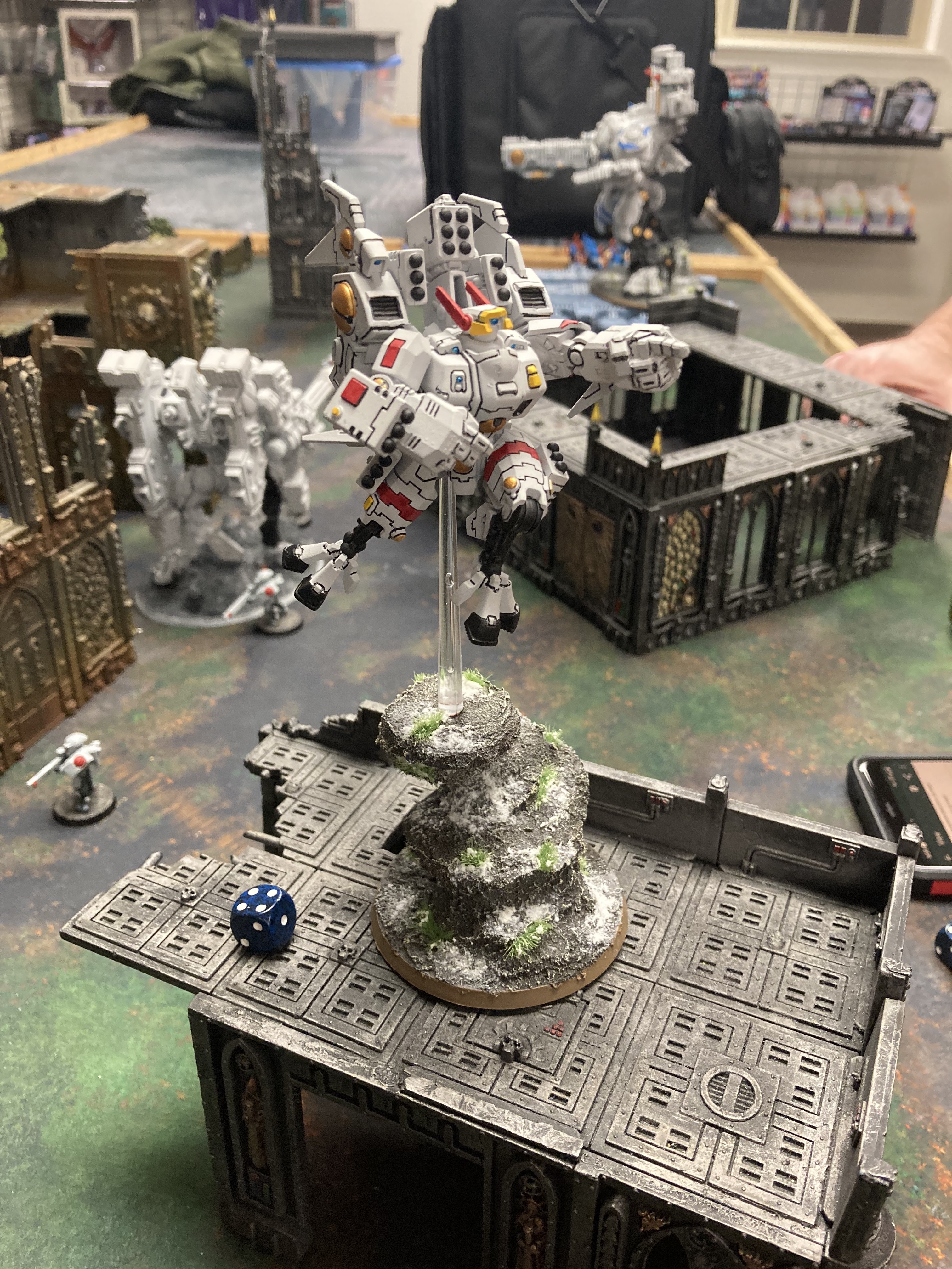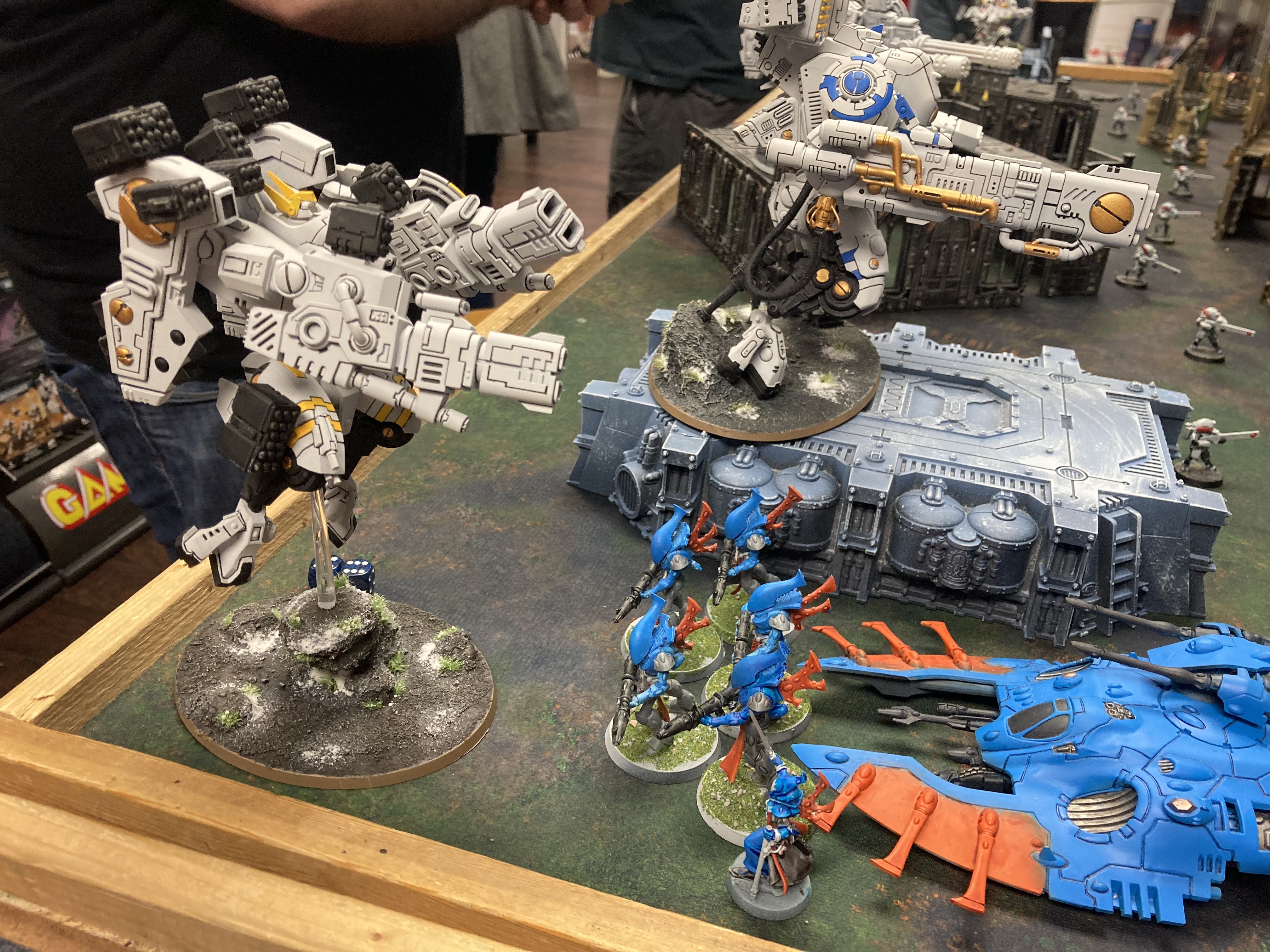As the Aeldari forces started to reach their target markers Baranyl was pulled out of those dark thoughts. She could feel the various threads of motion all captured in the spirit matrix of her ship, feeding back all the impressions across the battlefield. Her concern focused on the heavier battlesuits, as those would be the ones most jeopardizing their forces in the morning. A contingent of Wraithguard with Wraithcannon unloaded on one of the larger suits, and while a pure hurricane of missile shots and large laser blasts were returned, the Tau suit caught the worst of the exchange as chunks of its superstructure were displaced with the blasts.