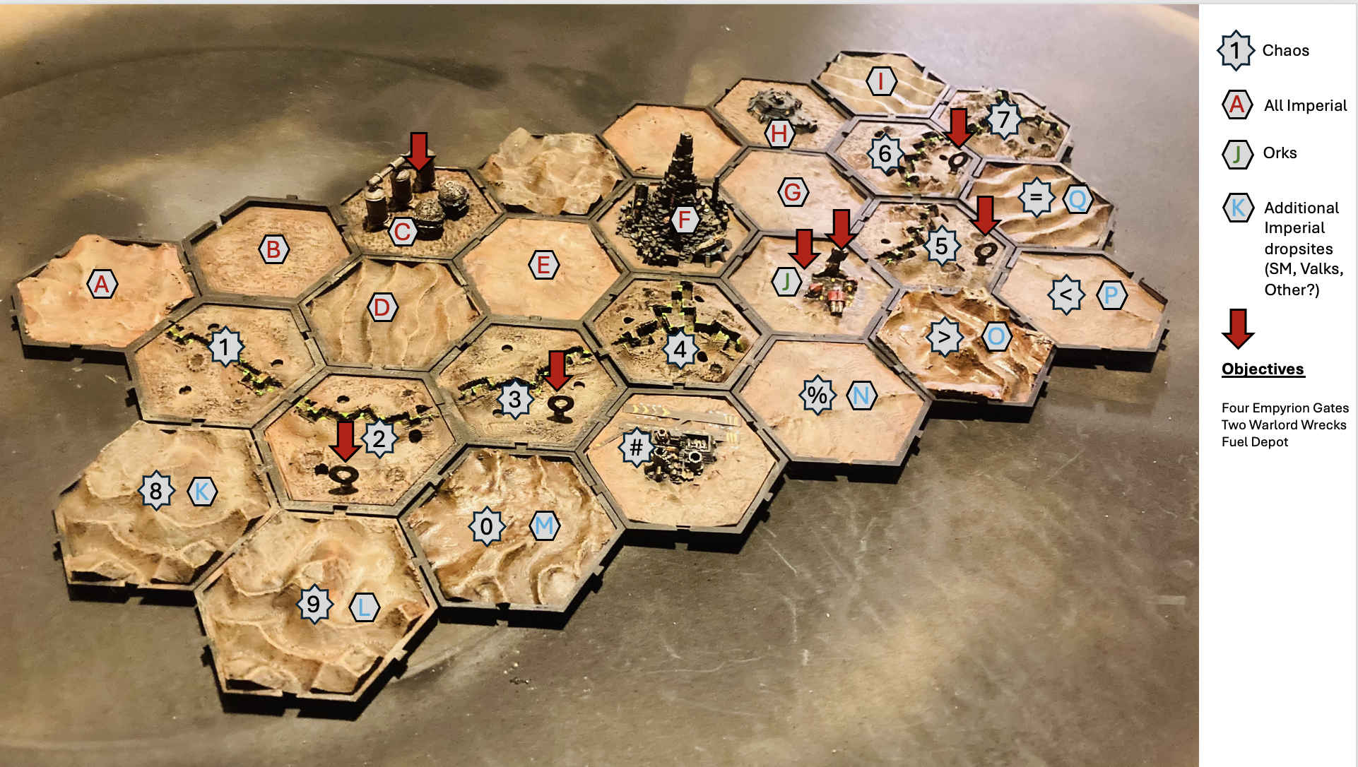 Players are also encouraged to be creative about their engagement with the objectives. They are welcome to develop strategies about them and run those past the event organizer, who can adjudicate additional rules about how those strategies may (or may not) work. Remember that the results of the end-state of objectives in this mission affect the way the second mega-battle objectives will be done.