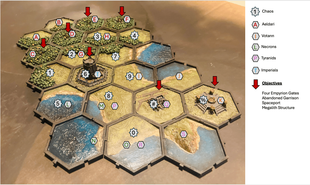 This map of the battle region of Drifblú will be at the store. Players will take a small piece of card (provided) and write their name on it and select a hex. That will determine where they will deploy. Players sent their initial choices to me as Crusade organizer, and there should be sufficient–but we wanted to make sure that they can adjust upon conferring with their team.