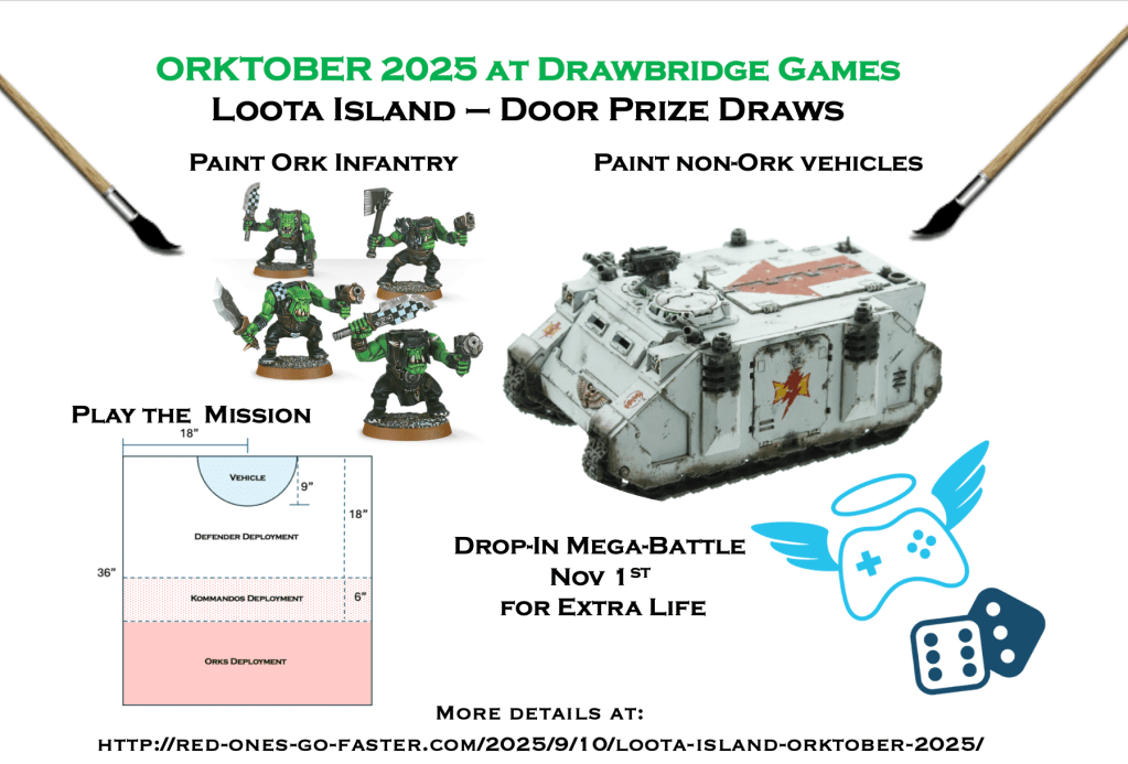 It’s time for the month of Ork-tober 2025 at Drawbridge Games. And we’ve got some fun planned with a month-long event that culminates in an all-day (and maybe much of the night) Mega-Battle on November 1st–which happens to be the Extra Life charity fundraiser day this year. We’re calling the whole thing “Loota Island” and there are going to be a lot of ways for players to participate, from painting to skirmish battles to the big event.