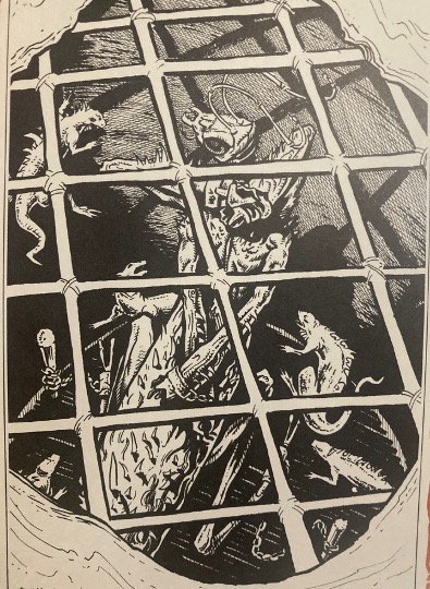Corin found himself in a gloomy small cavern, which looked to be a combination of stable for their Kanks and a drops–a pit of sludgy offal-laden water lay off the far side of the small room. The room contained one Kank, which startled by Corin’s appearance started to attack. Thrak-Chul rushed into the room and tried to wrestle the beast off the cliff into the drops. However the creature was a beast of burden, and strongly resisted the push–forcing Corin to leverage his bardic magic to strike at the weak beast brain of the insectoid to try and subdue it. The pair eventually managed to slay it, and pushed its corpse down into the sewage water below.