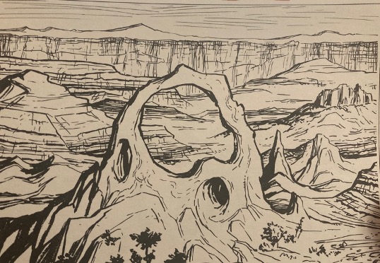They retraced their path for a few days across shifting sand dunes and barren flats to the poisoned oasis. It was easy to pick up the elven water party’s tracks, and followed those for a few days due east. Eventually they reached a set of gullies that grew into canyons, and found themselves at dusk peeking down at a strange rock hillock with various cave entrances and a big open hoop. There was evidence of mass encampment of elves at the base of the structure, including enough fire pits for an army and a large field of vegetation.