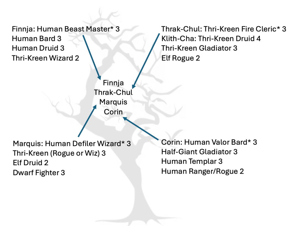 With an army of potentially 100 elves potentially about to return, the adventurers then escaped and climbed up out of the canyon. As they traveled there was some discussion of the strange waves of defiling energy that all felt–Marquis lied and said that it was the magic of the elf cleric that did such harm. Most seemed to buy that argument, but Thrak-Chul knew that Marquis was most likely lying. The hike back to the oasis was dry but uneventful. The party split ways with Klith-Cha, who promised to heal the oasis waters over time. However he promised to return to find them when he was done (DM’s note: Mike chose to swap Klith-Cha into being one of his character tree characters as noted below). The quartet then journeyed south to the town of Kled once more to inform them of what happened. The town elder saw the obsidian maul, now carried by Finnja, as a sign that the elves had been at very least decapitated in some of their leadership. As a thanks, he allowed Thrak-Chul to retain the magic bone spear with its healing properties.