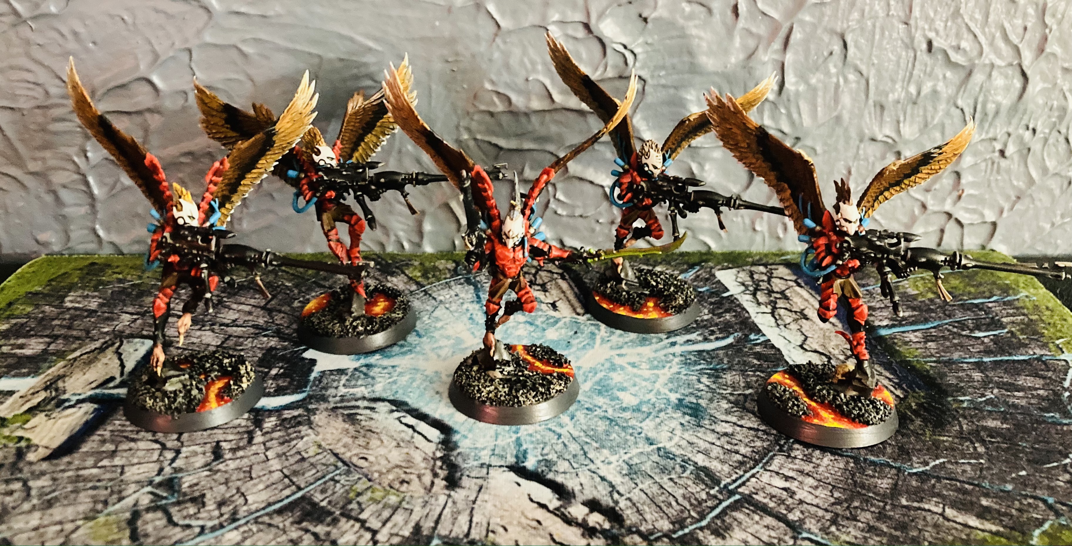 That meant adding even more Drukhari Wracks to my forces. Tried to batch paint them in greater numbers, but working on groups of five ultimately became what I could tolerate. Did five (above) with an Acothyst bearing a Mindphase Gauntlet and a Stinger Pistol plus one model with a Liquifier Gun. Then another five to round them out to ten, with another Liquifier Gun. Again, I remain pleased with how these models look when they’re finished. Having now finished up 20 total of them they’re getting to be a sizeable addition to the force.