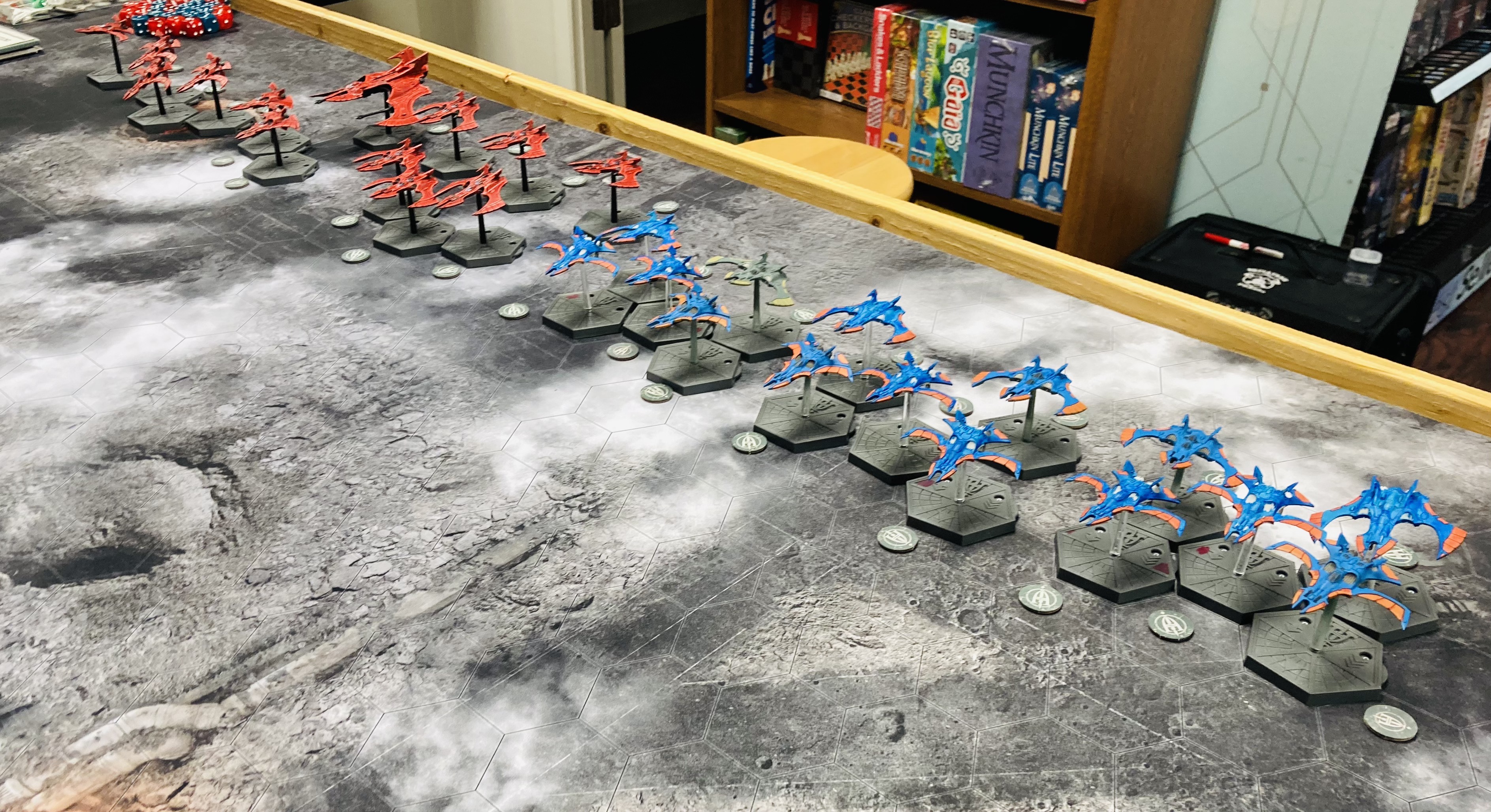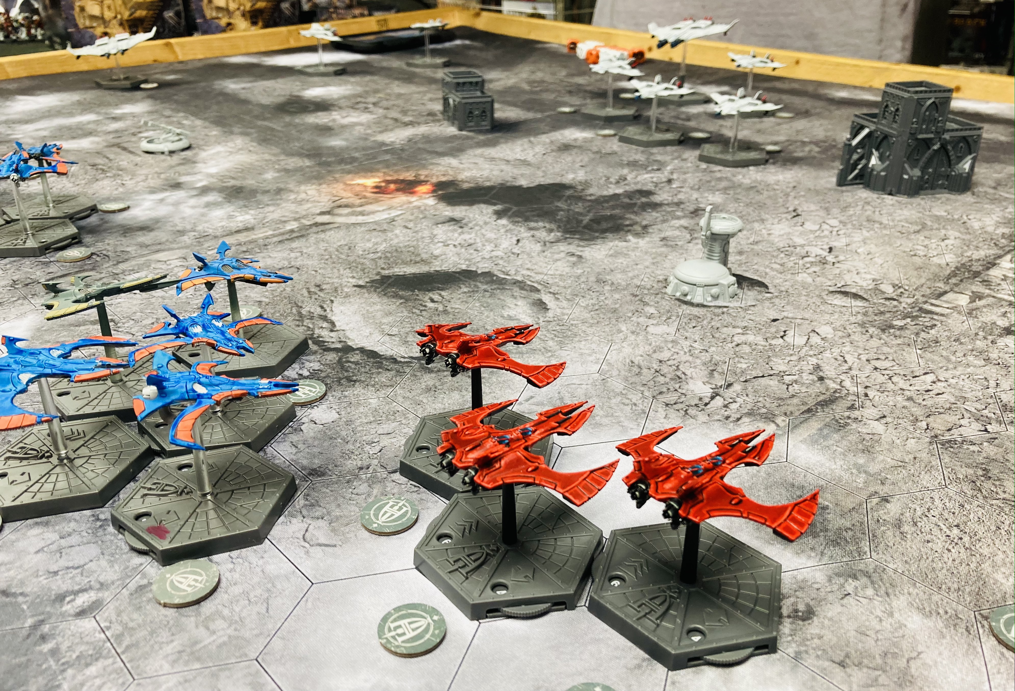 This is the second game of our “Invasion of Planet No’ohrm Ha’an D” series of battles, the second of the Aeronautica Imperialis missions that we’re doing to set the stage. The prior fluff is here: https://the-dark-muse.com/2023/01/02/the-invasion-of-planet-noohrm-haan-d/ and the recap of the first mission is here: https://the-dark-muse.com/2023/01/24/air-caste-in-retreat/. Plus the rules for running the Aeornautica Imperialis portion of the battles are here: https://the-dark-muse.com/2023/01/11/assault-neo-normandy-missions-1-strategic-air-war/. Enjoy!